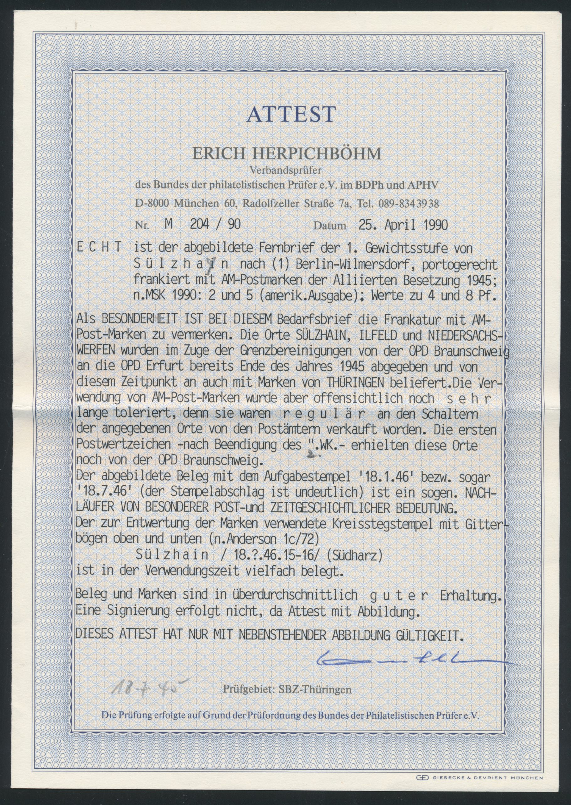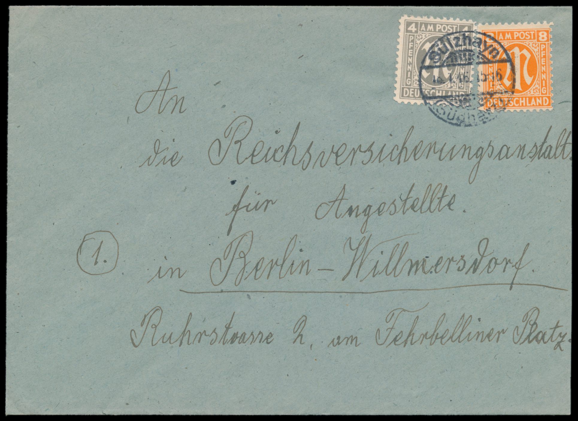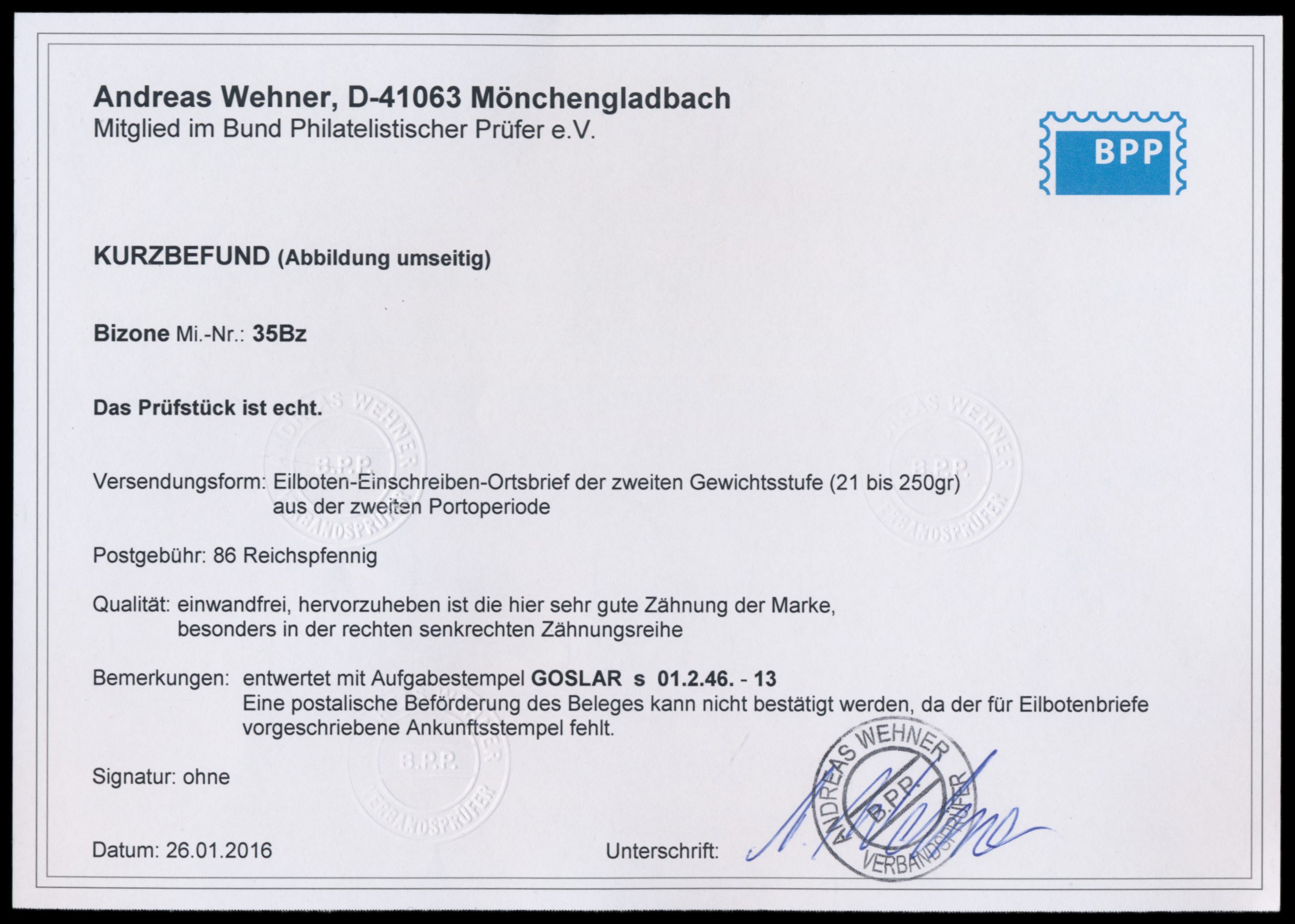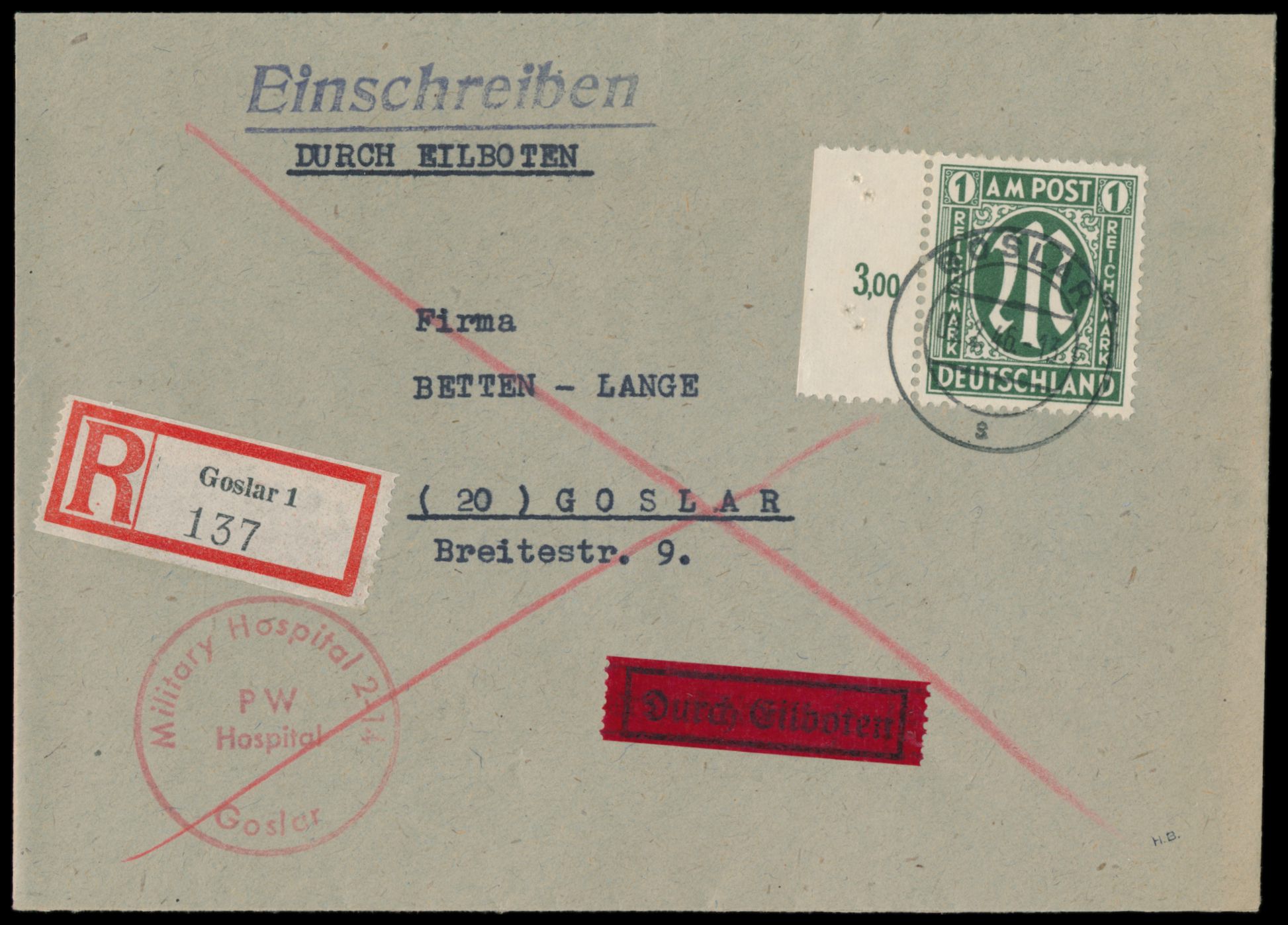 Einzelfrankatur 1 RM mit anhängendem Seitenrand links auf Orts-Eilboten-Einschreibbrief mit Stempel Goslar 1.2.46, ohne Ankunftstempel, seltene Verwendung in der 1. Portoperiode, Befund Wehner BPP: echt, Marke sehr gut gezähnt, eine postalische Beförderung kann nicht bestätigt werden