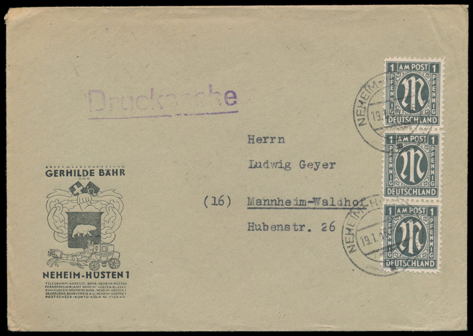 senkrechter Dreierstreifen 1 Pf. mit besserer Zähnung 11 1/2 : 11 auf Drucksache, Stempel Neheim-Hüsten 1 19.1.46, nach Mannheim, portorichtig, Bedarf, MiPr. 500