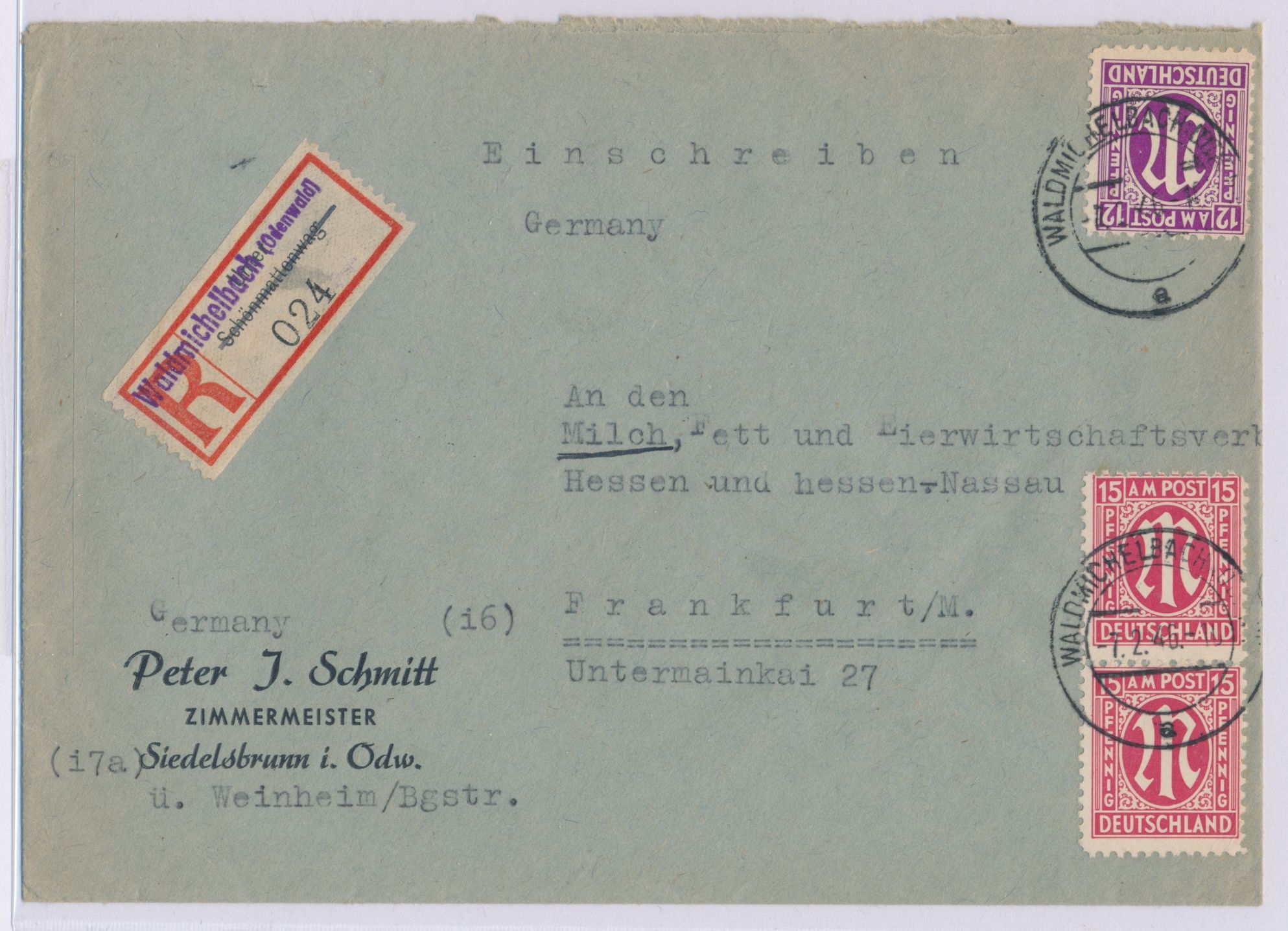 12 Pf. und 2 x 15 Pf. auf Einschreibbrief mit Stempel Waldmichelbach (Odenwald) 7.2.46 nach Frankfurt, alter Reichspost-R-Zettel von Schönmattenwag mit dünnem Rahmen überstempelt, Ankunftstempel 8.2.46, Bedarf