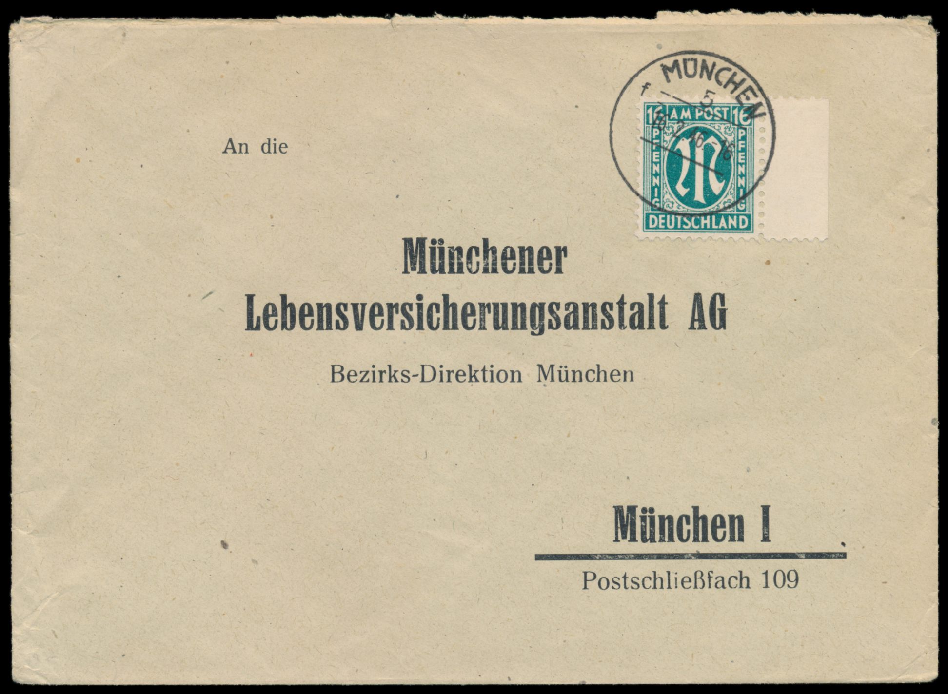Einzelfrankatur 16 Pf. auf Ortsbrief 2. Gewicht, Stempel München 5 16.2.46, seltene portorichtige Verwendung in der 1. Portoperiode, Bedarf, MiPr. 370