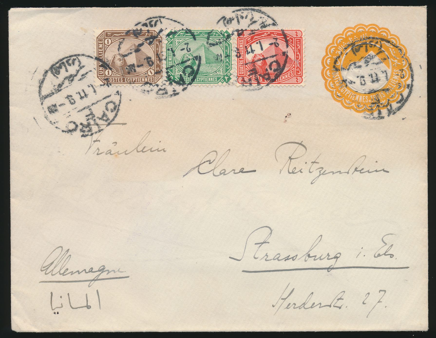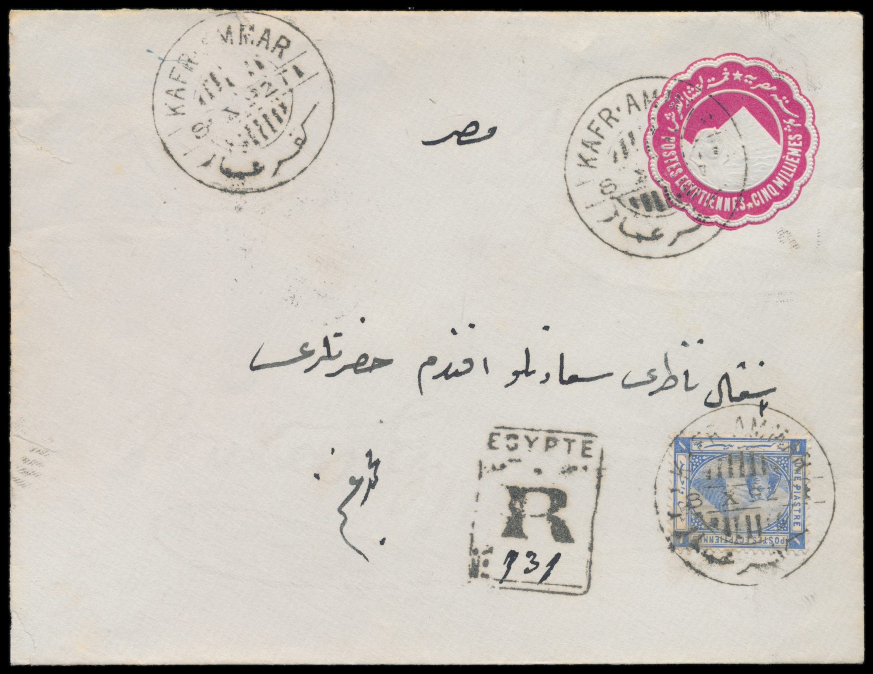 Ganzsachenumschlag 5 M. mit Zusatzfrankatur 1 Pia. als Einschreibbrief mit Stempel Kafr-Ammar 8.10.92 und R-Stempel mit handschriftlicher Nr., Ankunftstempel Caire 8.10.92