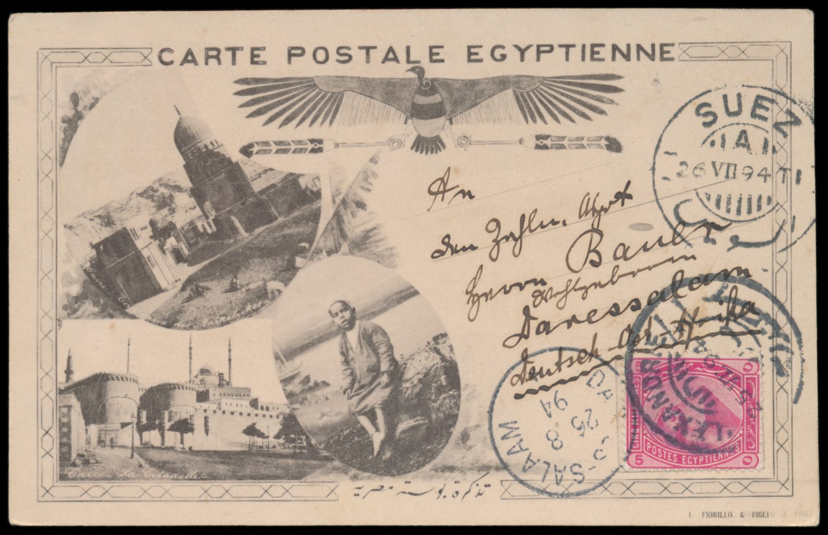 5 M. auf Dreibild-Ansichtskarte mit adresseitiger Abbildung, Stempel Alexandrie 25.6.94, nach Deutsch-Ostafrika, Durchgangsstempel Suez 26.7.94, Ankunftstempel Dar-es-Salaam 26.8.94