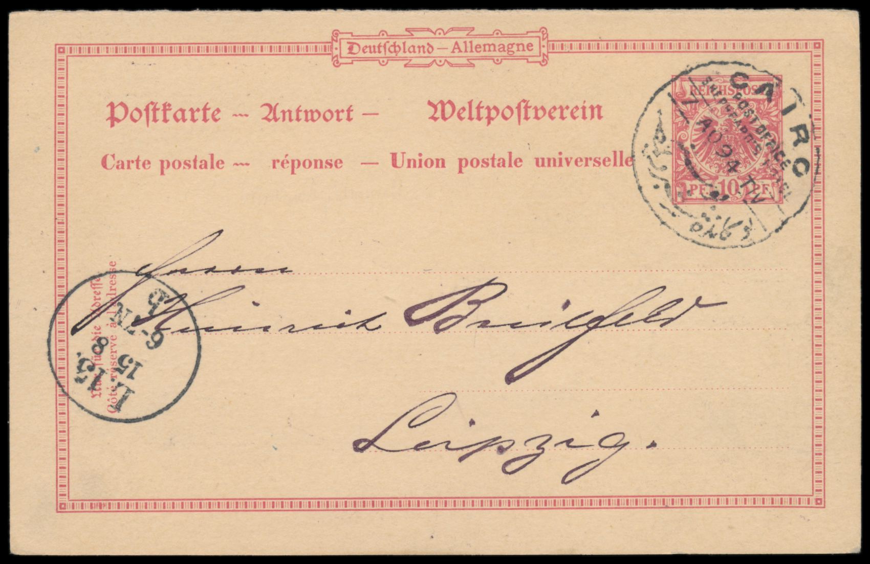Stempel Cairo Post Office Shepheard´s Hotel 7.8.94 auf Dt. Reich-Ganzsachen-Antwortteil 10 Pf. zurück nach Deutschland, Ankunftstempel Leipzig 15.8.94