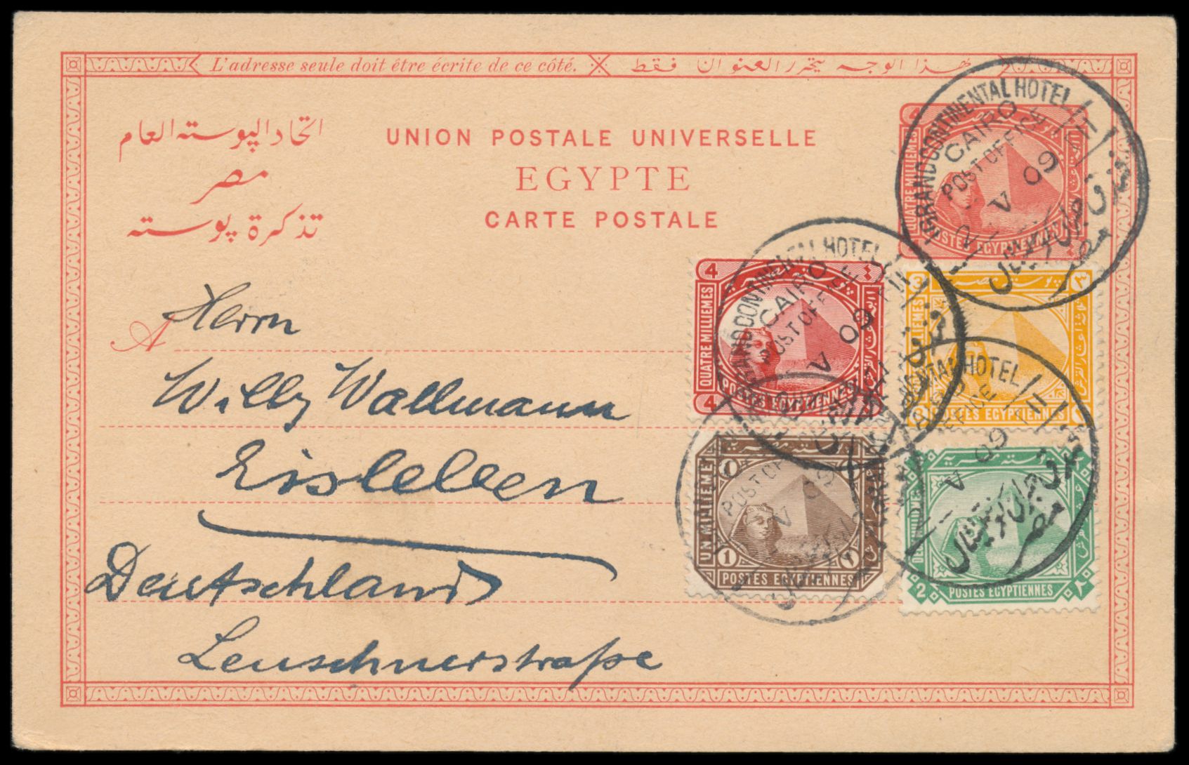 Stempel Grandcontinental Hotel Cairo Post Office 2.5.09 auf Ganzsache 4 M. mit Zusatzfrankatur 1, 2, 3 und 4 M. nach Deutschland, Bedarf