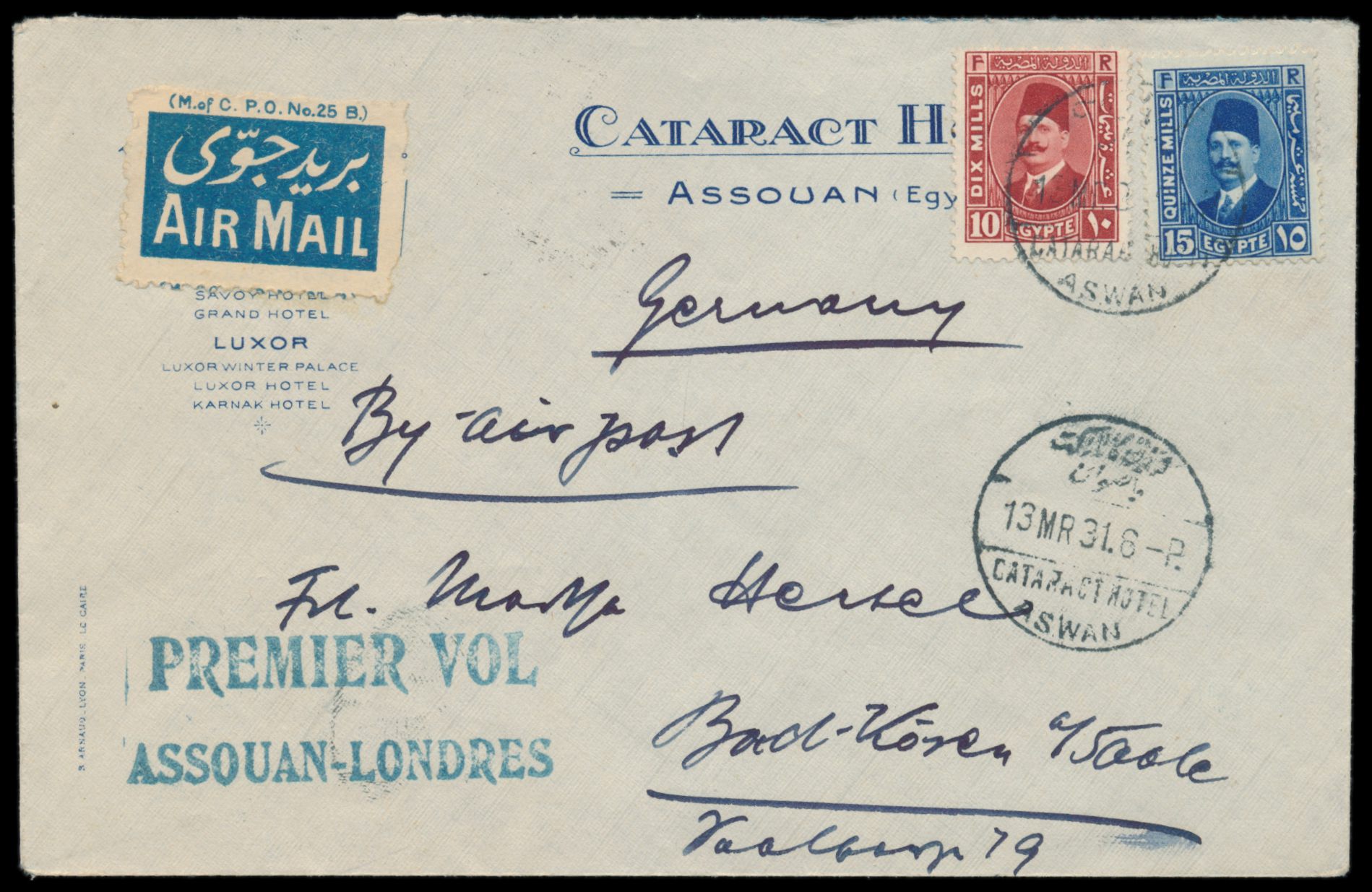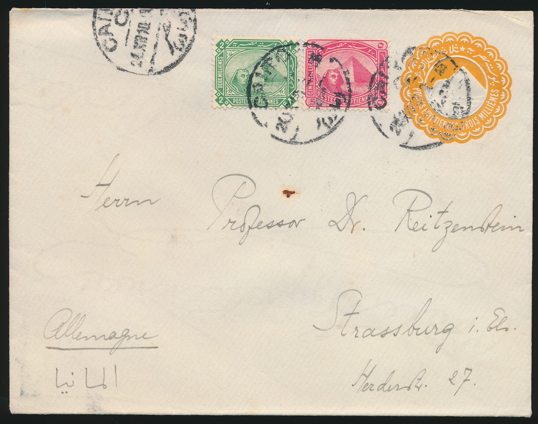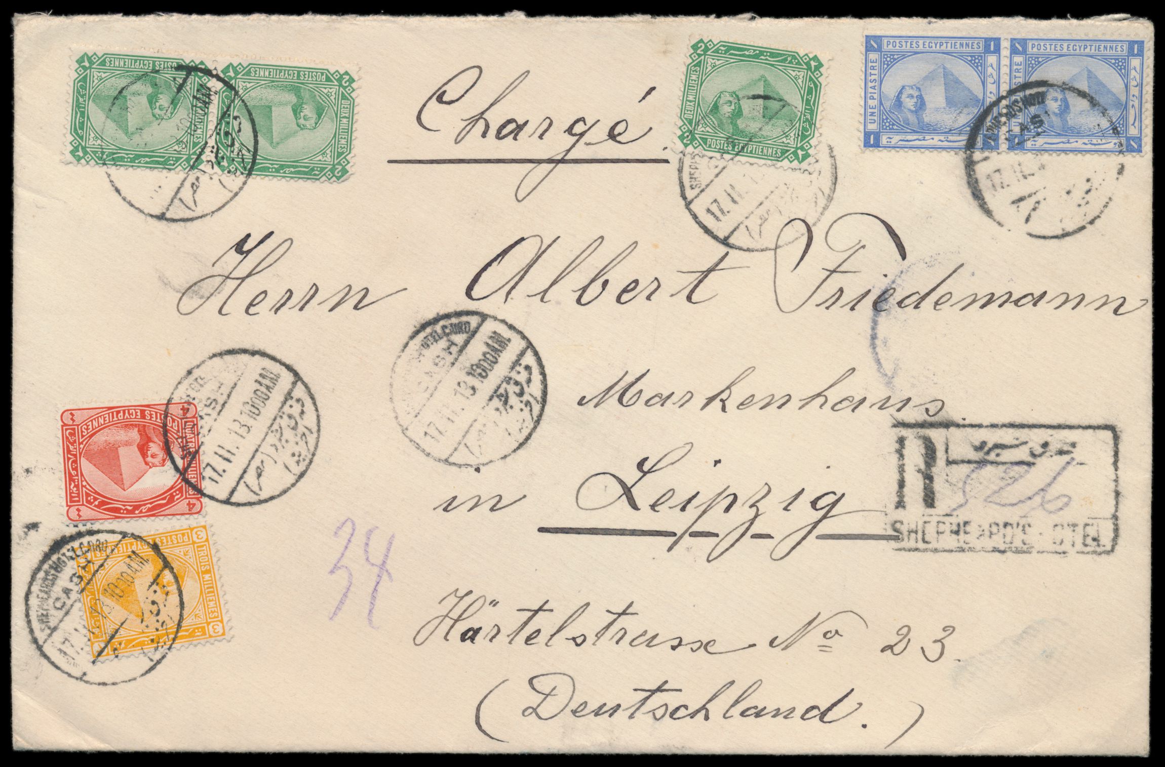 Einschreibbrief mit 3 x 2 M., 3 M., 4 M. und 2 x 1 Pia. nach Deutschland, Stempel Shepheard´s Hotel Cairo Cash 17.11.13, R-Stempel Shepheard´s Hotel mit handschriftlicher Nr., Durchgangsstempel Cairo 17.11.13, Bedarf