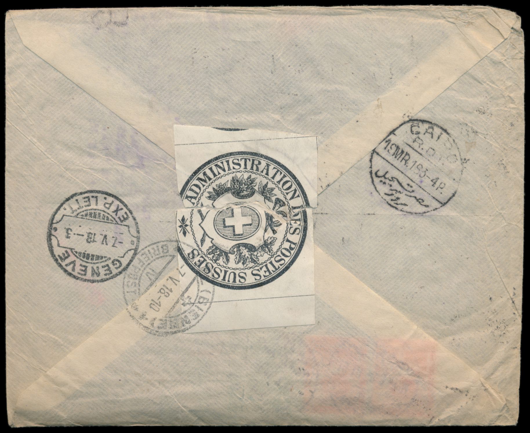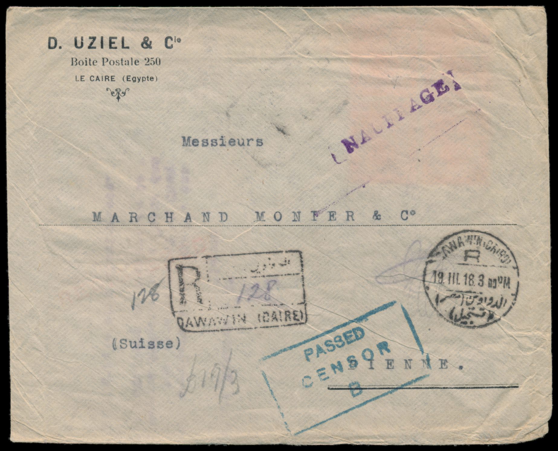 Einschreibbrief mit Stempel Dawawin (Cairo) 19.3.18 in die Schweiz, Zensurstempel "Passed Censor B", befördert mit S.S. Kingstonian von Alexandria nach Marseille, Frankatur abgefallen und übliche Wasserspuren, violetter L1 Naufrage, rückseitig schweizer Postverschlusszettel und Ankunftstempel Geneve 7.5.18. Der Brief stammt aus geborgener Post des am 11.4.1918 westlich Sardinien durch das deutsche U-Boot UB 68 torpedierten und am 29.4.1918 durch UB 48 endgültig versenkten Dampfers Kingstonian.