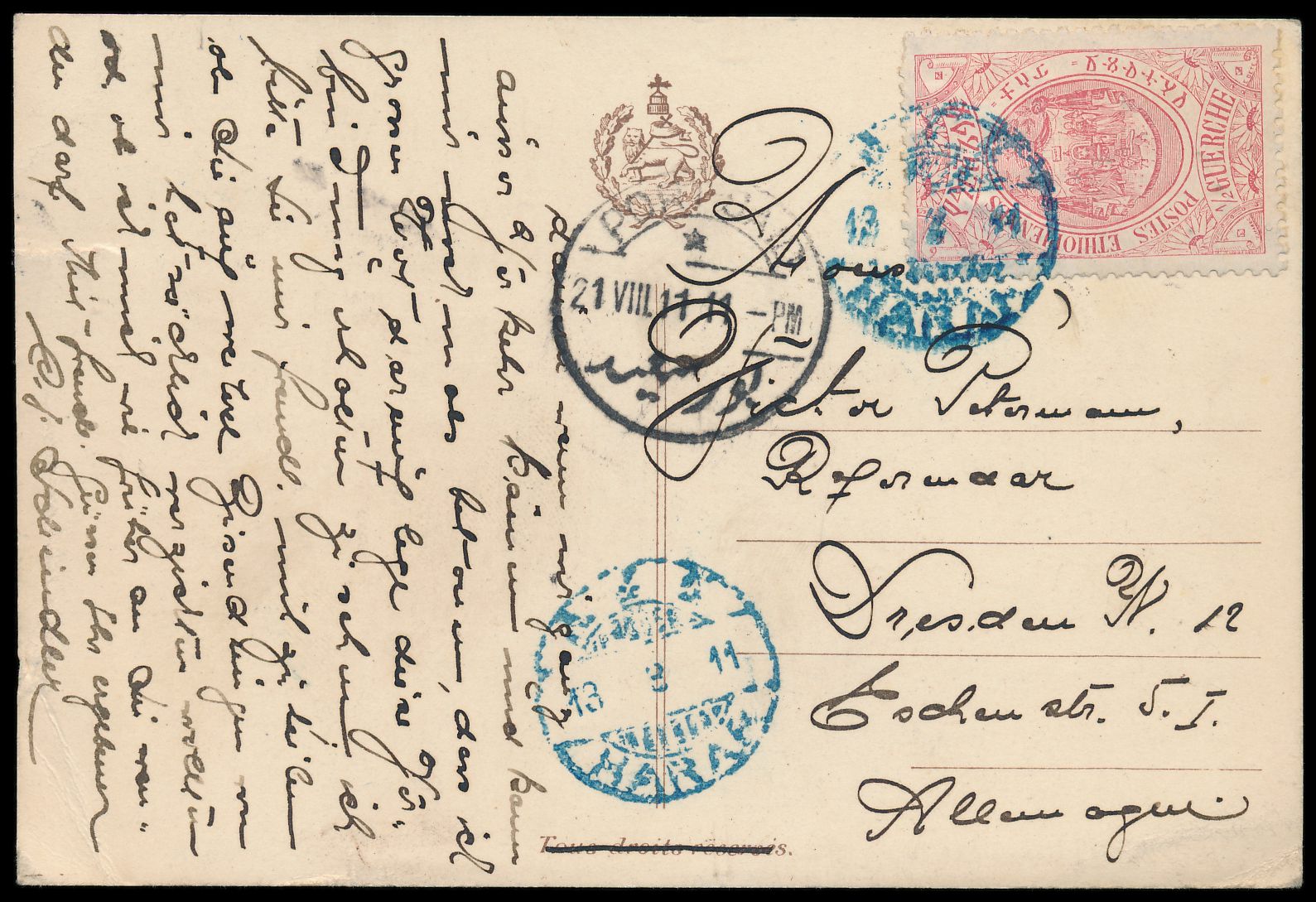 1/2 G. Wappen (Ausgabe 1909) auf Formularkarte, 2 x blauer Stempel Harar 13.3.11, nach Dresden, Durchgangsstempel Port Said 21.8.11, Bedarf
