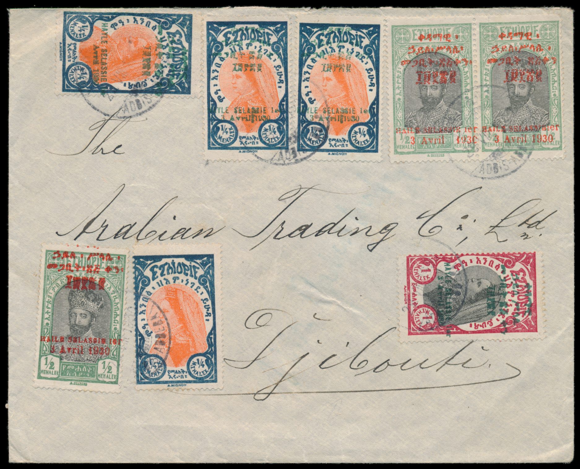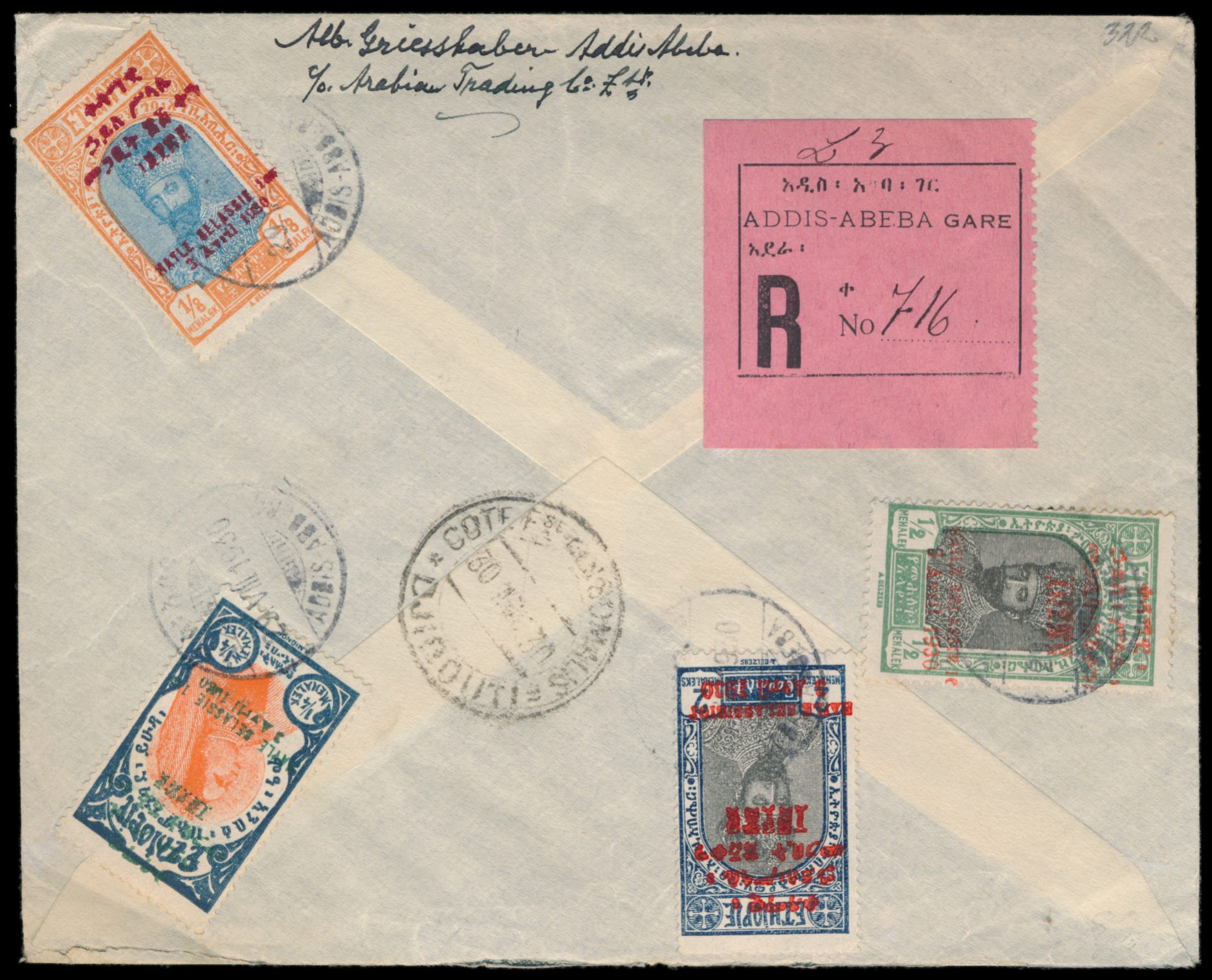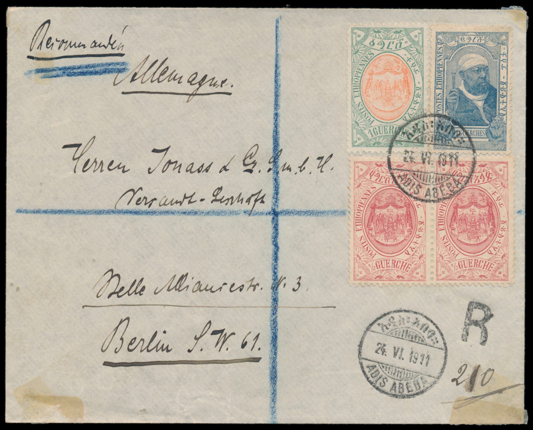 Ausgabe 1909: 2 x 1/2 G., 1 G. und 2 G. auf Einschreibbrief mit Stempel Adis Abeba 24.6.1911 nach Berlin, R-Stempel mit handschriftlicher Nr. 210, Absender Haertel, Adis Abeba, Bedarf