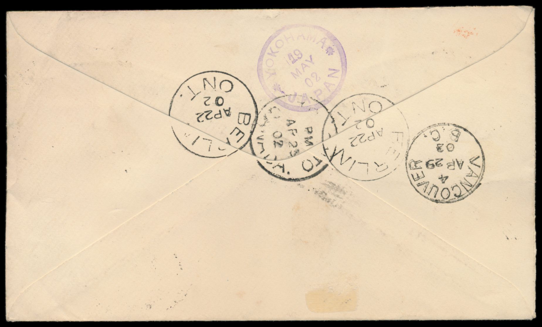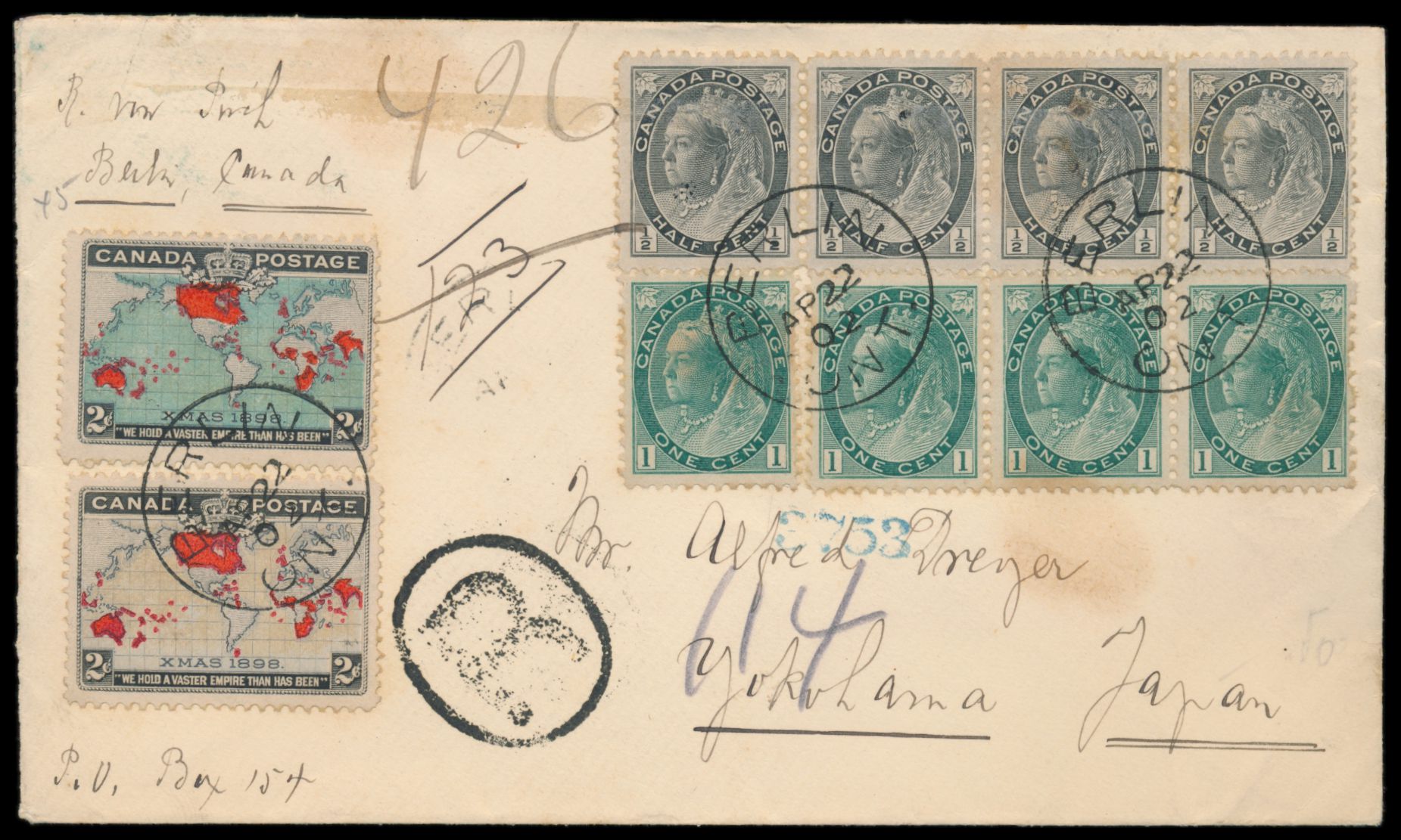 Imperial Penny Postage 2 C. (Map Issue) in beiden Ausführungen mit QV 4 x 1/2 C. und 4 x 1 C. auf Einschreibbrief nach Japan, Stempel Berlin 22.4.01, Durchgangstempel Toronto 23.4.02 und Vancouver 29.4.02, Ankunftstempel Yokohama 19.5.02