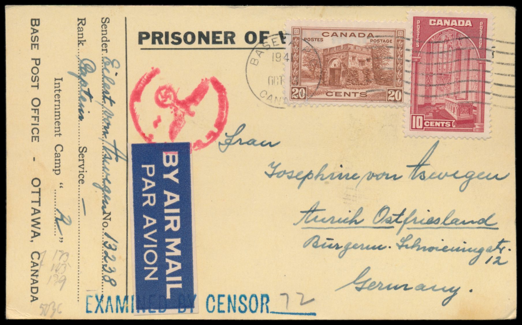 10 C. und 20 C. als Luftpostzuschlag auf Kriegsgefangenen-Vordruckkarte nach Deutschland, Maschinenstempel Base A.P.O. 13.10.41, Absender ist Eilert von Aswegen (Deutsche Handelsmarine) im Camp R (Red Rock, Ontario) , Lager bestand nur von July 1940 bis Oktober 1941, hier also spätes Datum, blauer L1 Examined by Censor ... und deutscher Zensurstempel von Berlin