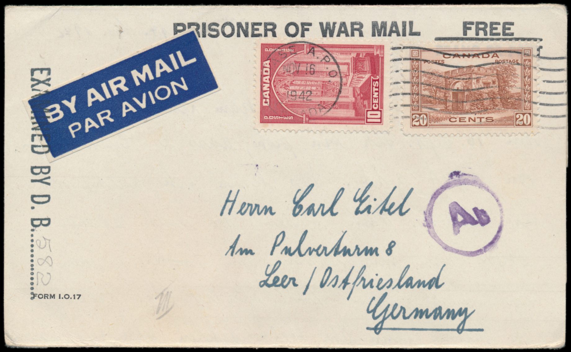 10 C. und 20 C. als Luftpostzuschlag jeweils auf Kriegsgefangenen-Vordruckfaltbrief und -Vordruckkarte nach Deutschland, Maschinenstempel Base A.P.O. 16.11.1942 und 13.1.1943, Absender ist Angehöriger der Deutschen Handelsmarine (war zuvor in Indien) im Camp 33 (Petawawa, Ontario) , L1 Examined by Censor ... und deutsche Zensur von Berlin