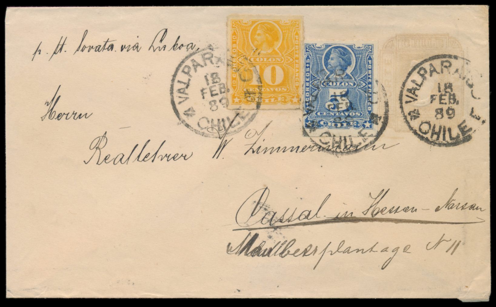 Ganzsachenumschlag Colon 5 C. mit Zusatzfrankatur Colon 5 C. und 10 C. nach Deutschland, Stempel Valparaiso 18.2.89, Ankunftstempel Cassel 30.3.89, Bedarf