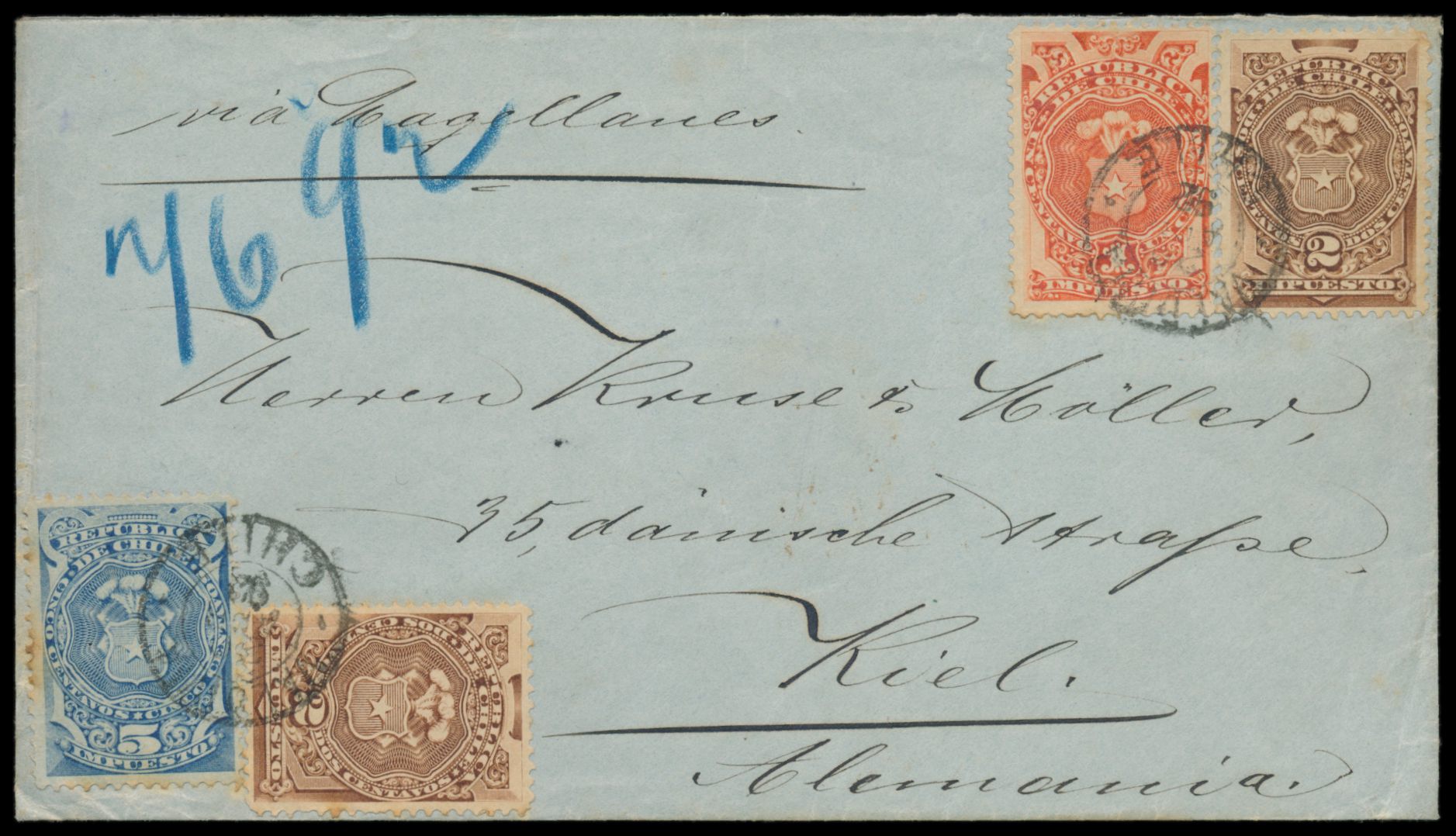 Stempelmarken "Impuesto" 1 C., 2 x 2 C. und 5 C. auf Brief "via Magellanes" nach Deutschland, Stempel Valdivia 22.4.92, Ankunftstempel Kiel 2.6.92, zwei Marken etwas fleckig, Bedarf