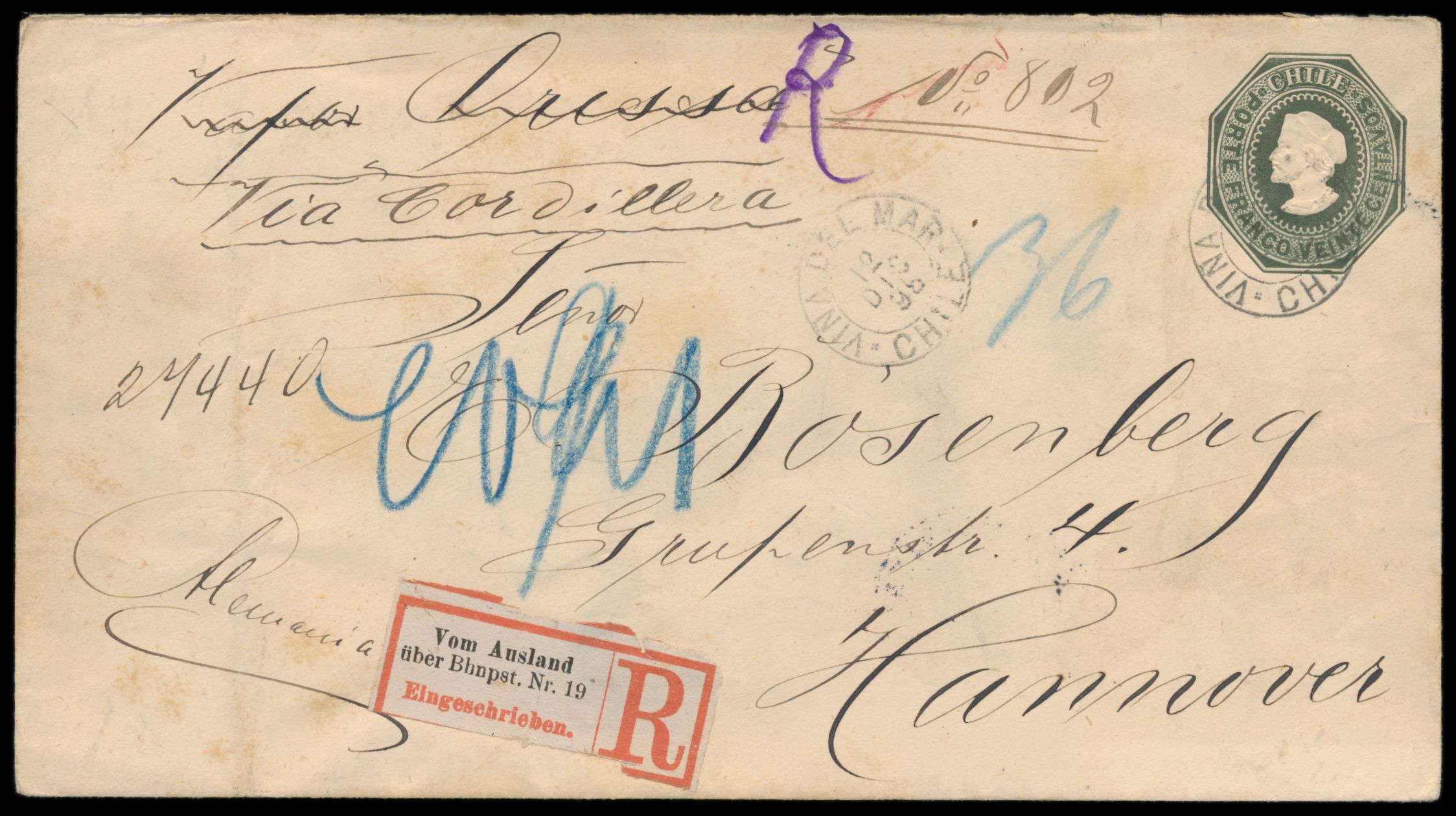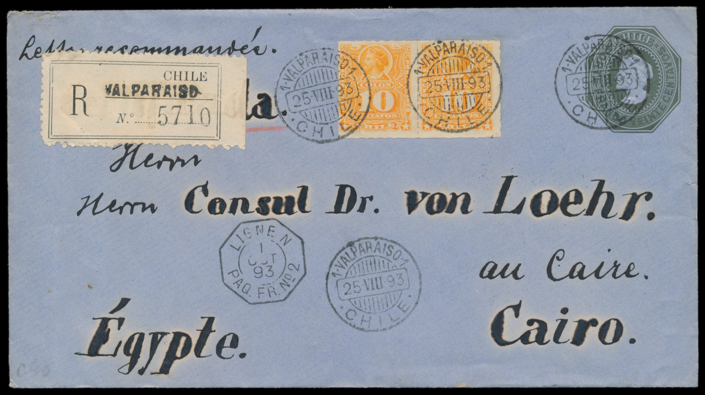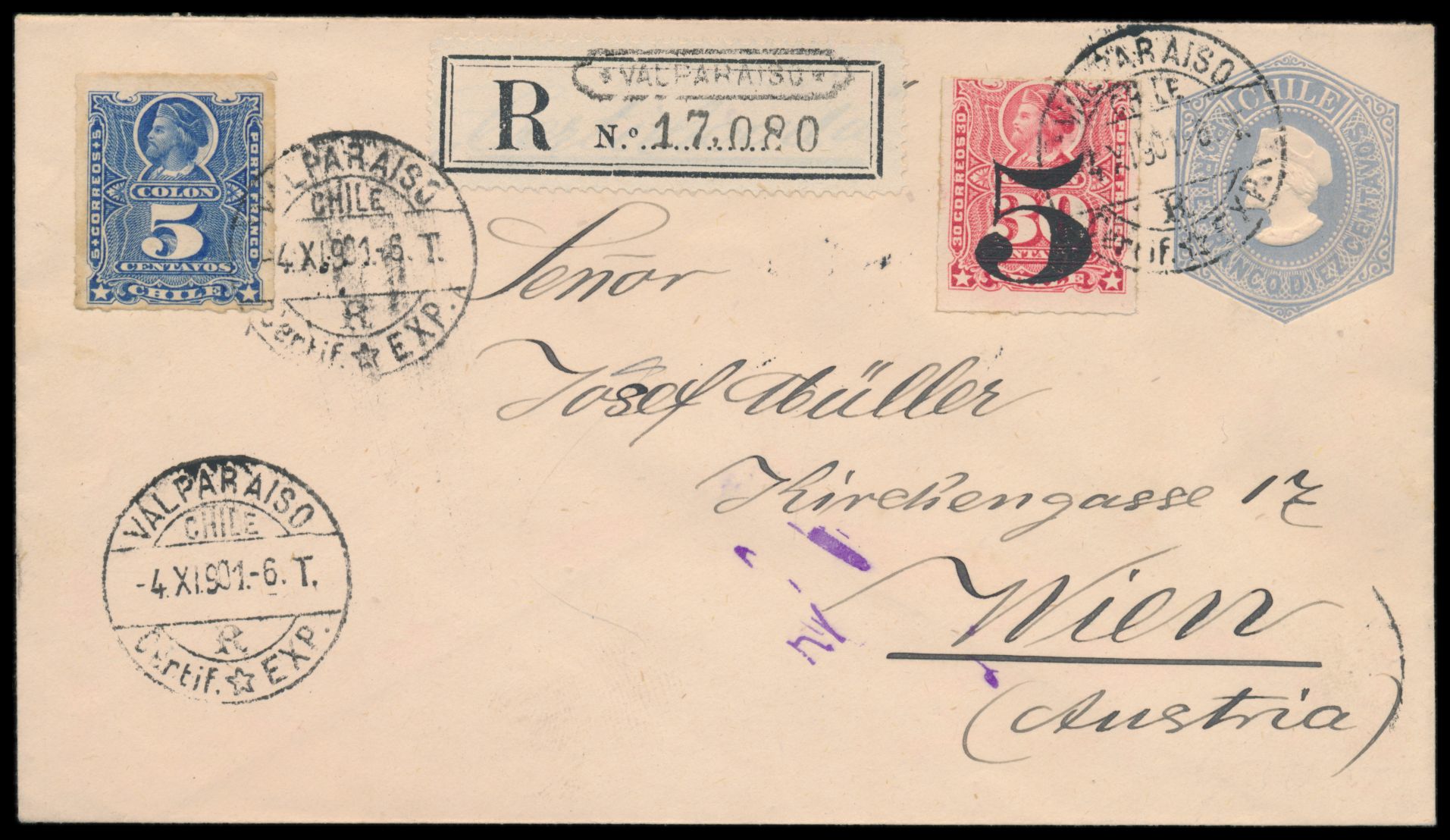 Ganzsachenumschlag Colon 10 C. mit Zusatzfrankatur Colon 5 C. blau und 5 C. auf 30 C. rot als Einschreiben nach Wien, Stempel Valparaiso 4.11.01, R-Zettel mit R1 Valparaiso, Ankunftstempel 8.12.01