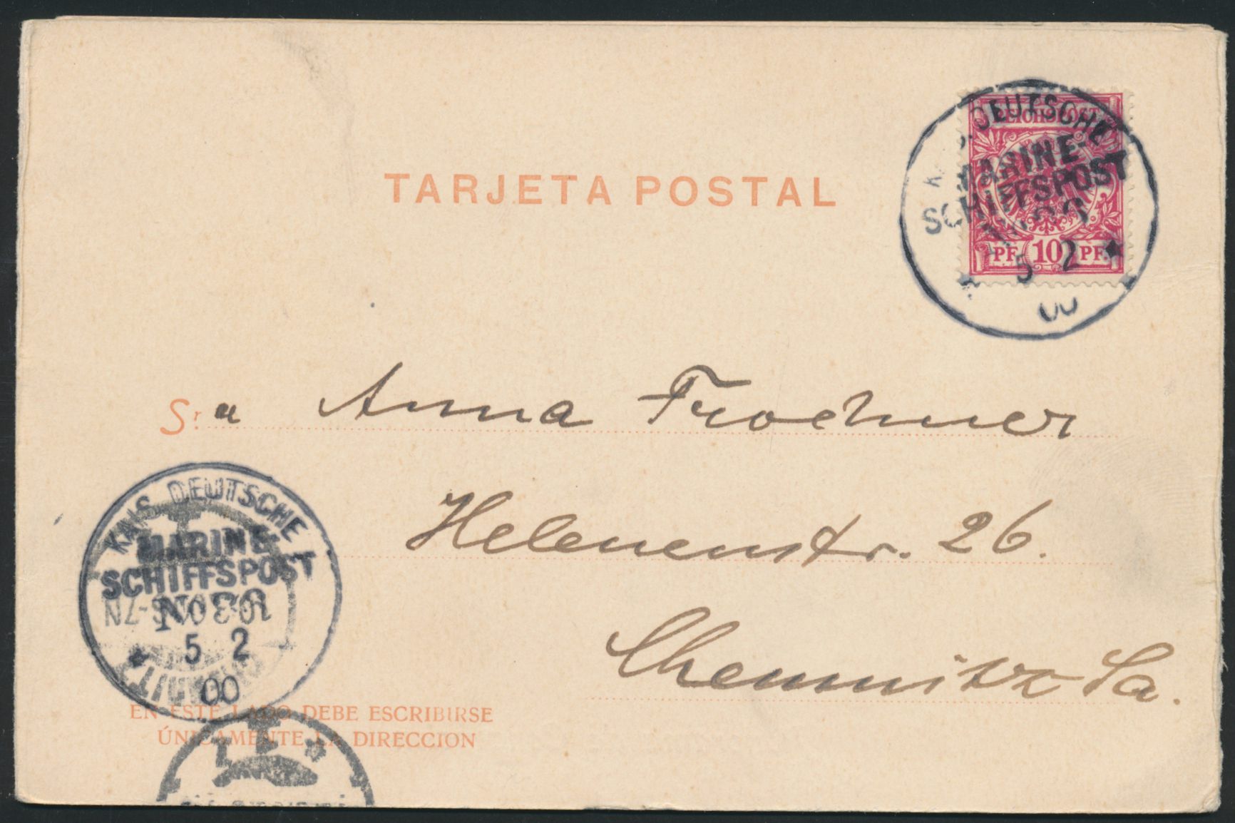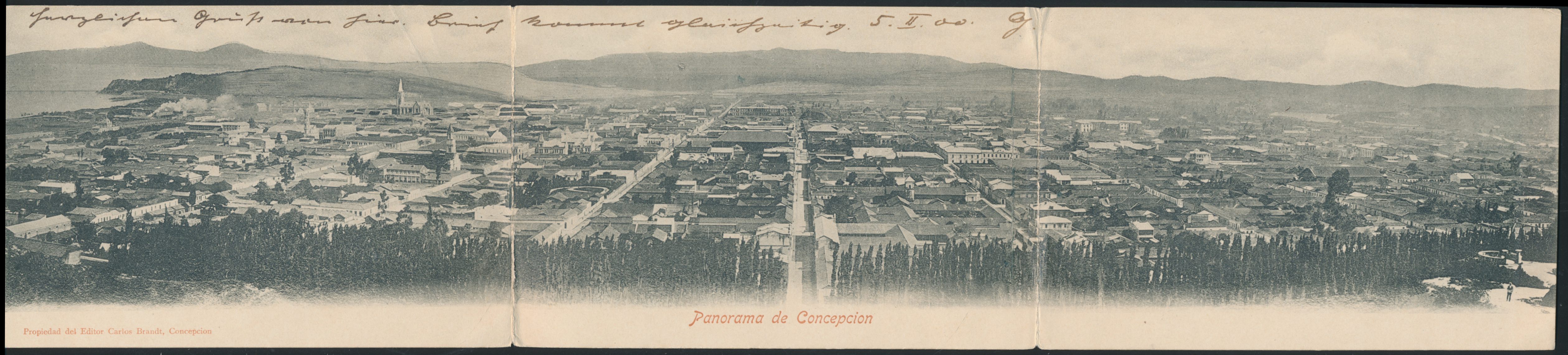 dreiteilige Klapp-Ansichtskarte "Panorama de Concepcion" , Verlag Carlos Brandt, Conepcion, Frankatur Deutsches Reich 10 Pf., 2 x Stempel Kais. Deutsche Marine-Schiffspost No. 36 5.2.00, S.M.S. Geier in Talchuano, nach Deutschland