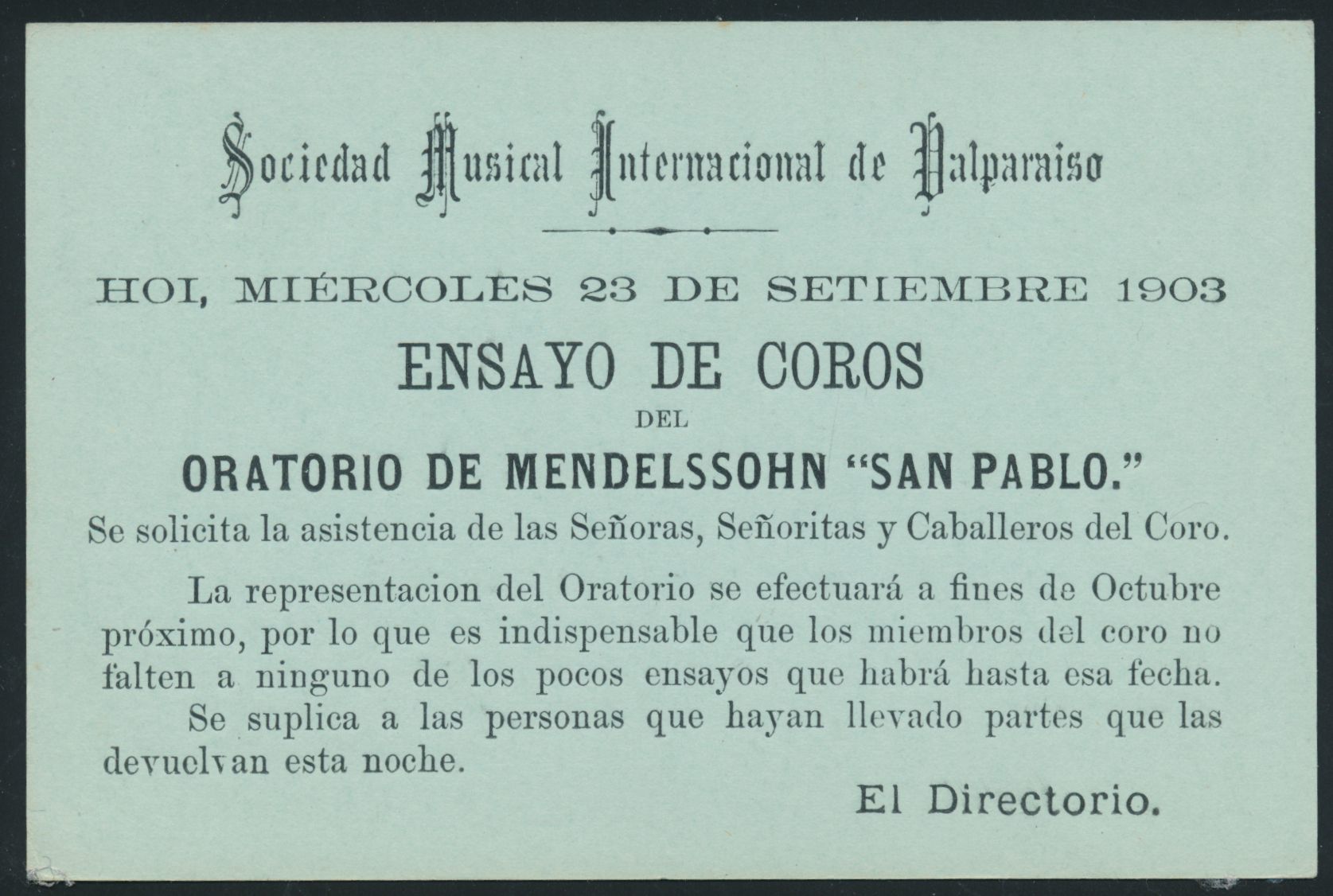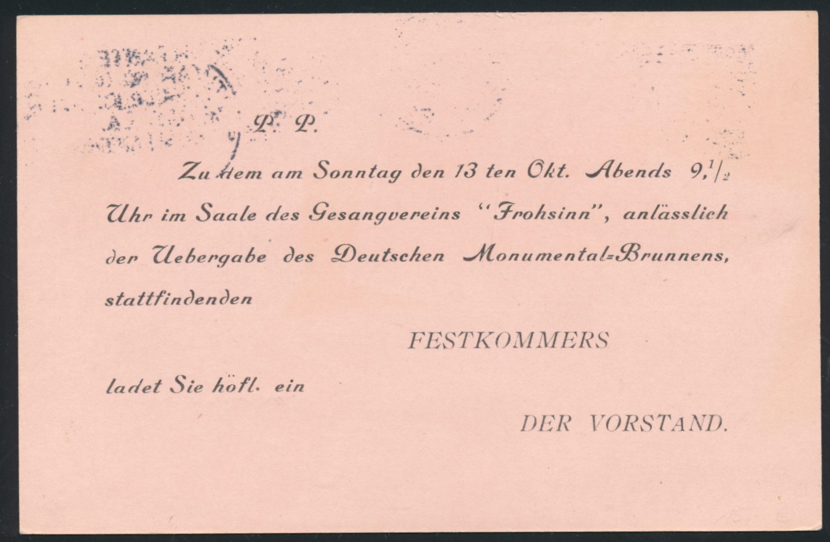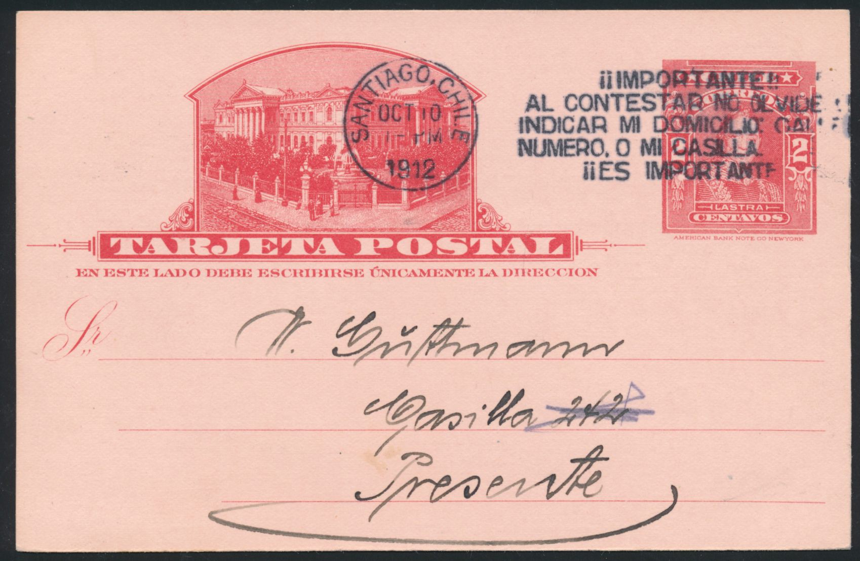 rote Ganzsache 2 Ct., Maschinenstempel Santiago "Il Importante ..." 10.10.1912, rückseitig Zudruck des Gesangvereins "Frohsinn" zur Übergabe des Monumentalbrunnens, Bedarf