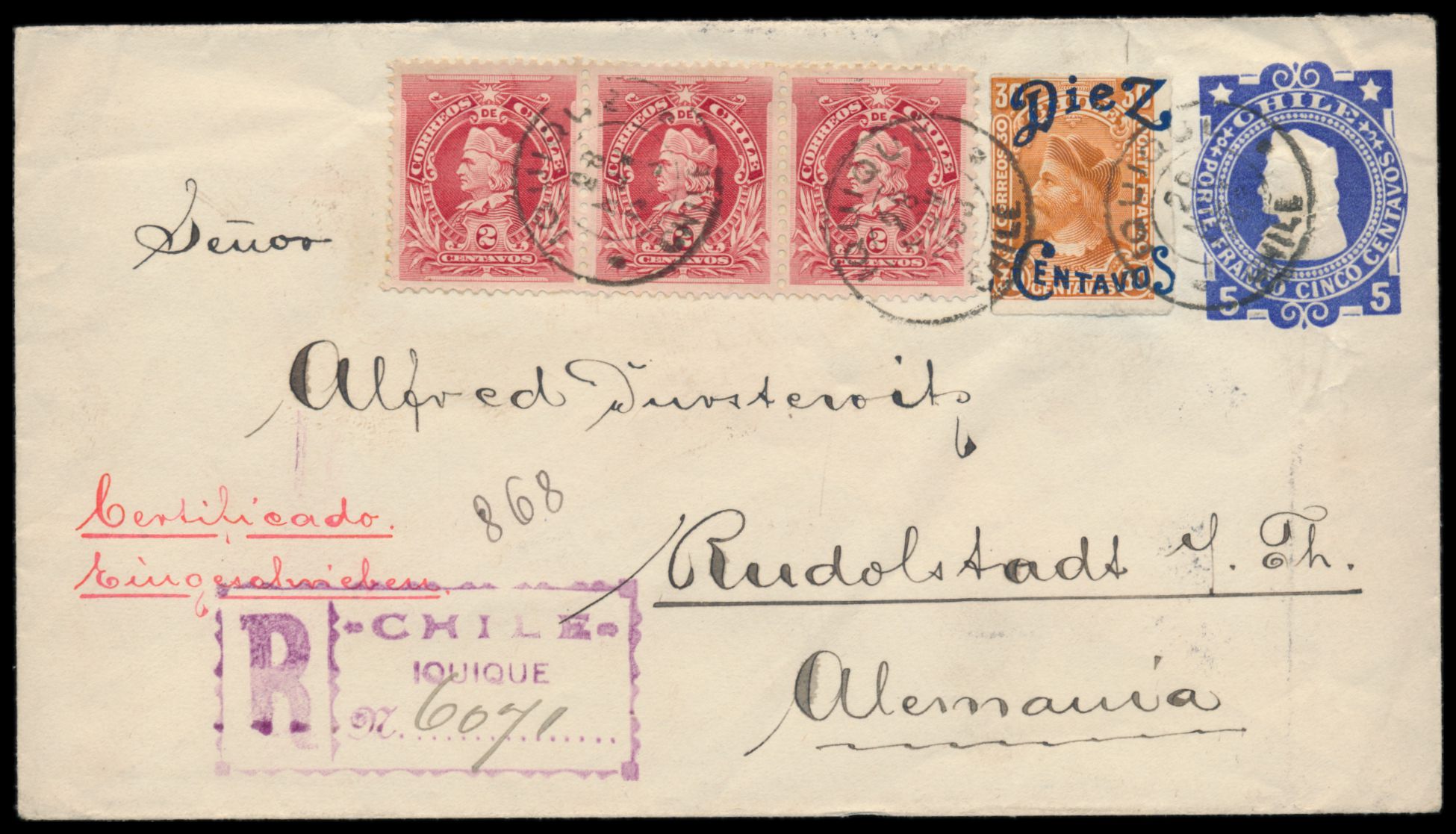 Ganzsachen-Umschlag 5 C. mit Zusatzfrankatur 3 x 2 C. und 10 C. auf 30 C. Colon als Einschreiben nach Deutschland, Stempel Iquique 29.11.04, violetter R-Stempel mit Zierrahmen, Ankunftstempel Rudolstadt 15.1.04