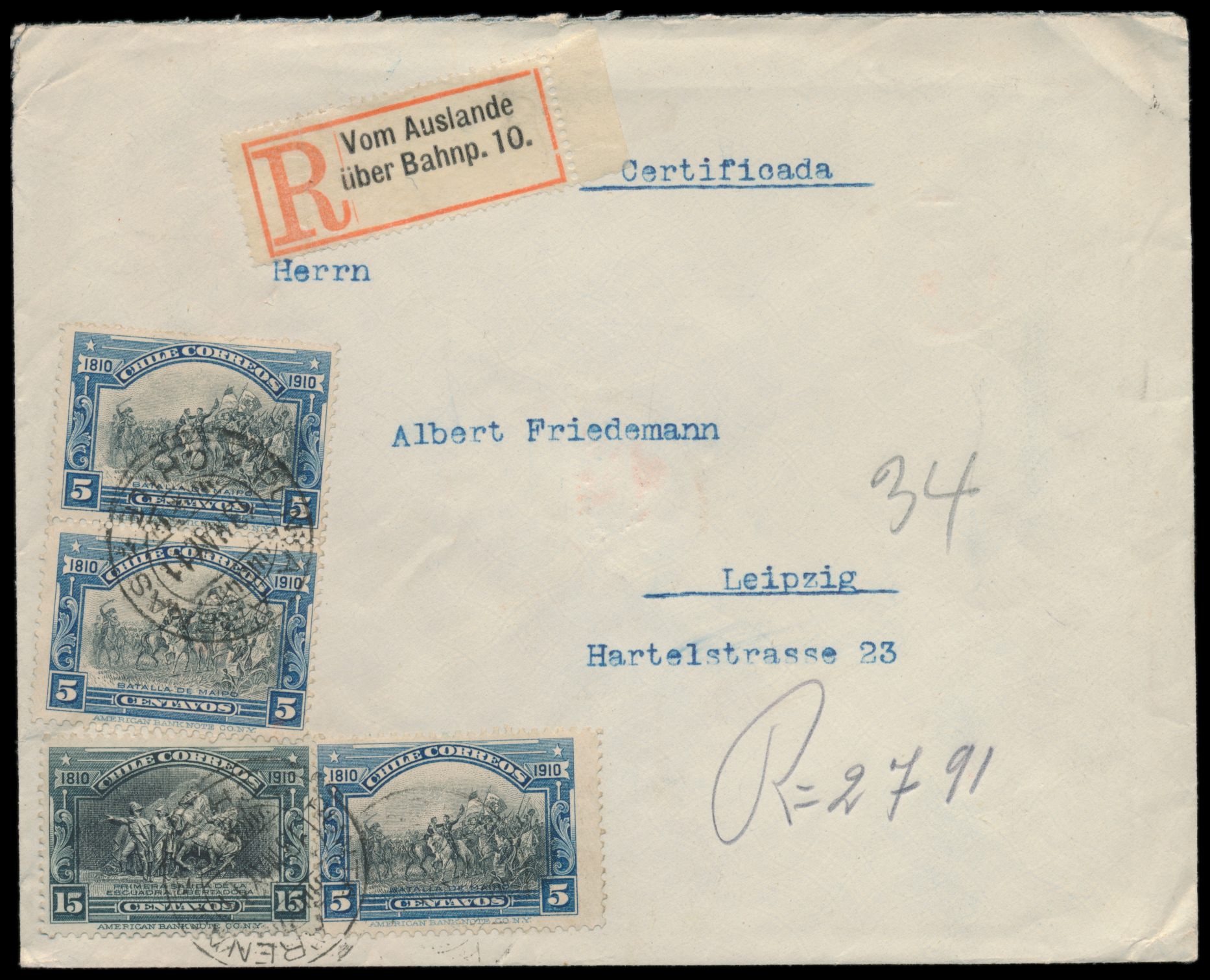Unabhängigkeit 3 x 5 C. und 15 C. (1910) auf Einschreibbrief mit Stempel Punta Arenas 13.5.11 und handschriftlichem R-Vermerk nach Deutschland, deutscher Eingangs-R-Zettel "Vom Auslande über Bahnp. 10." , Ankunftstempel Leipzig 11.6.11, Bedarf