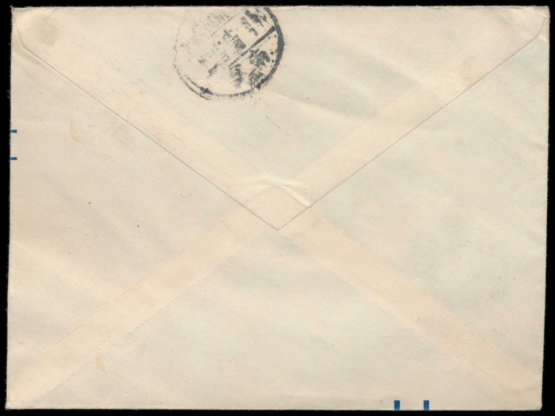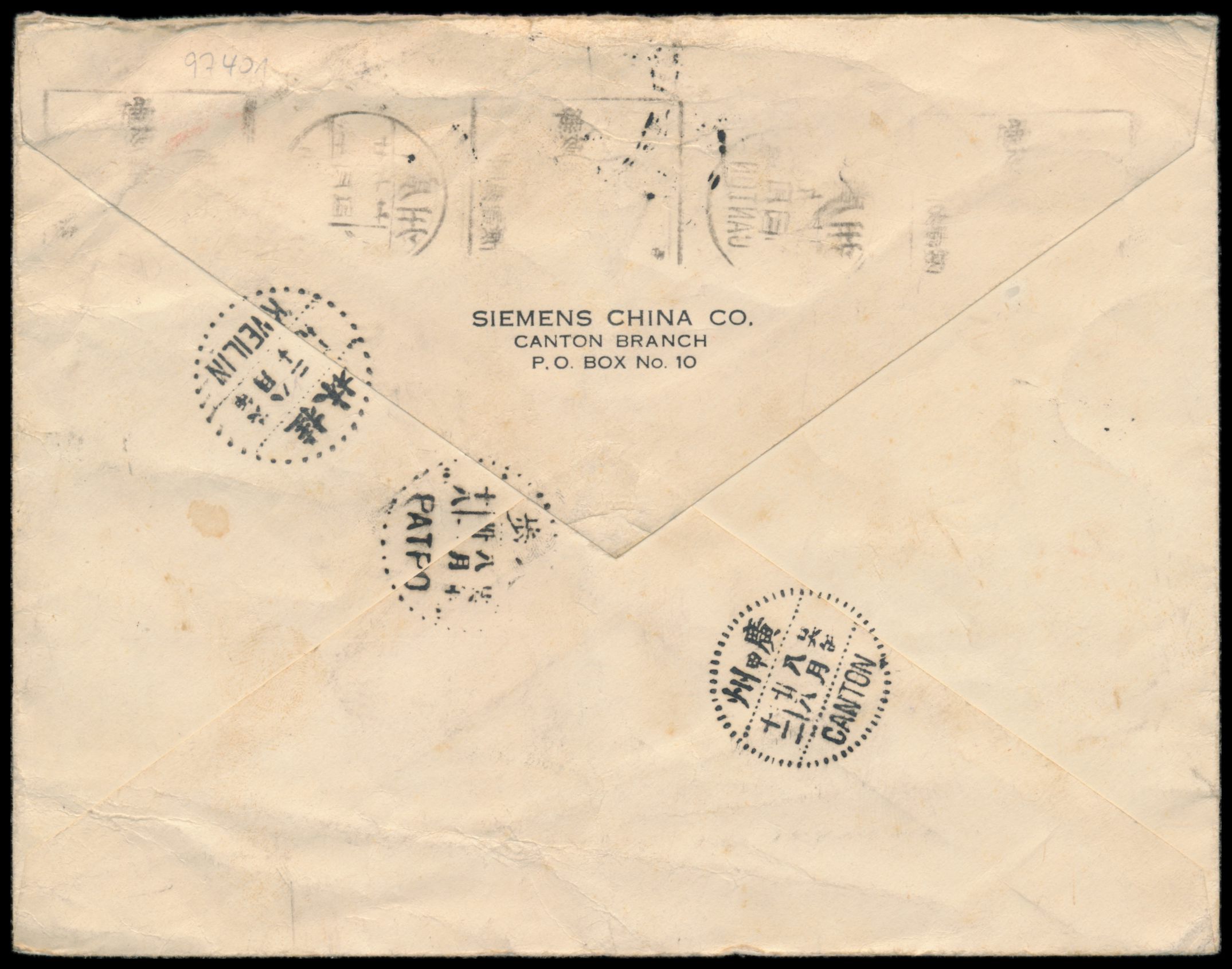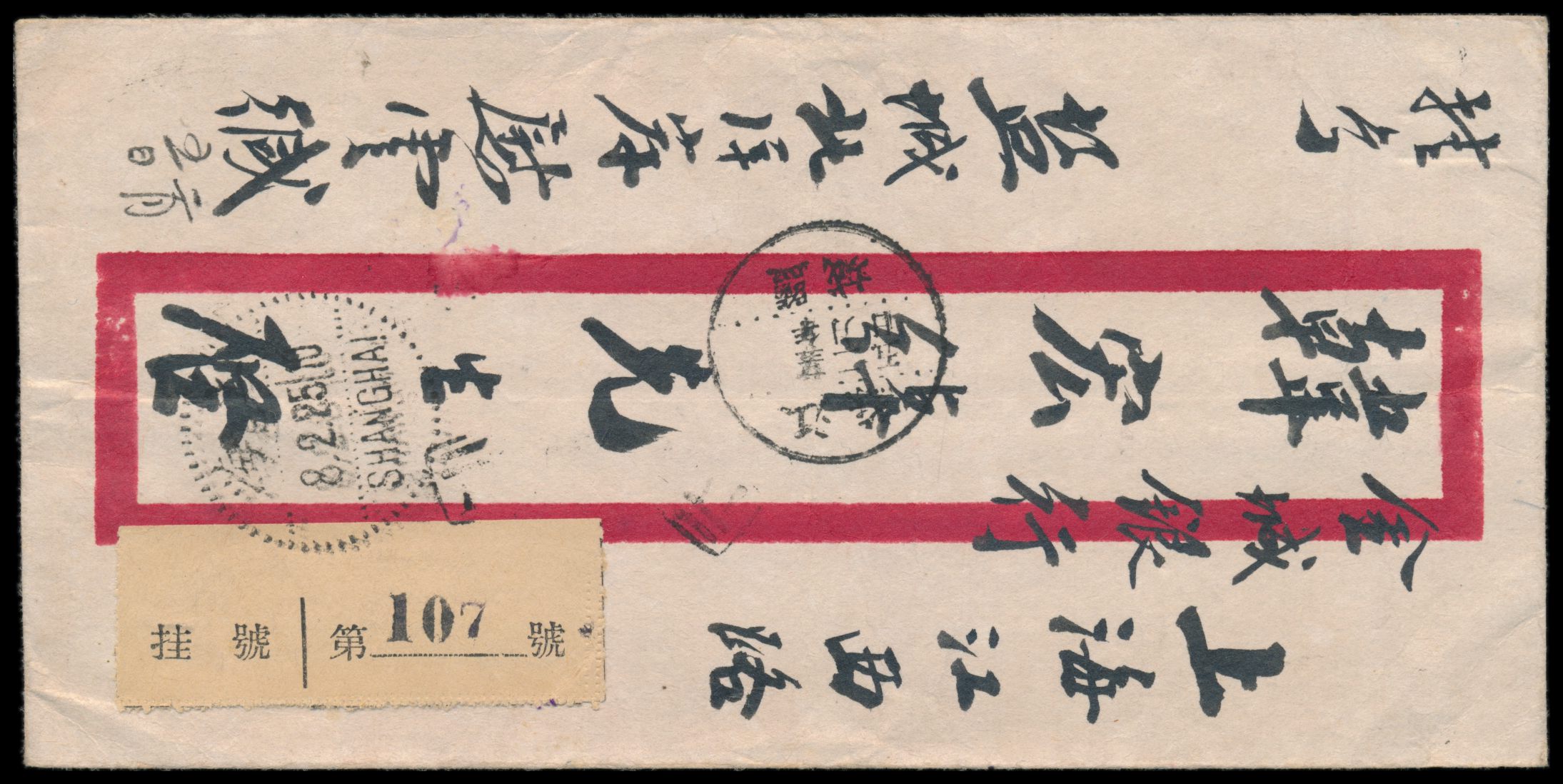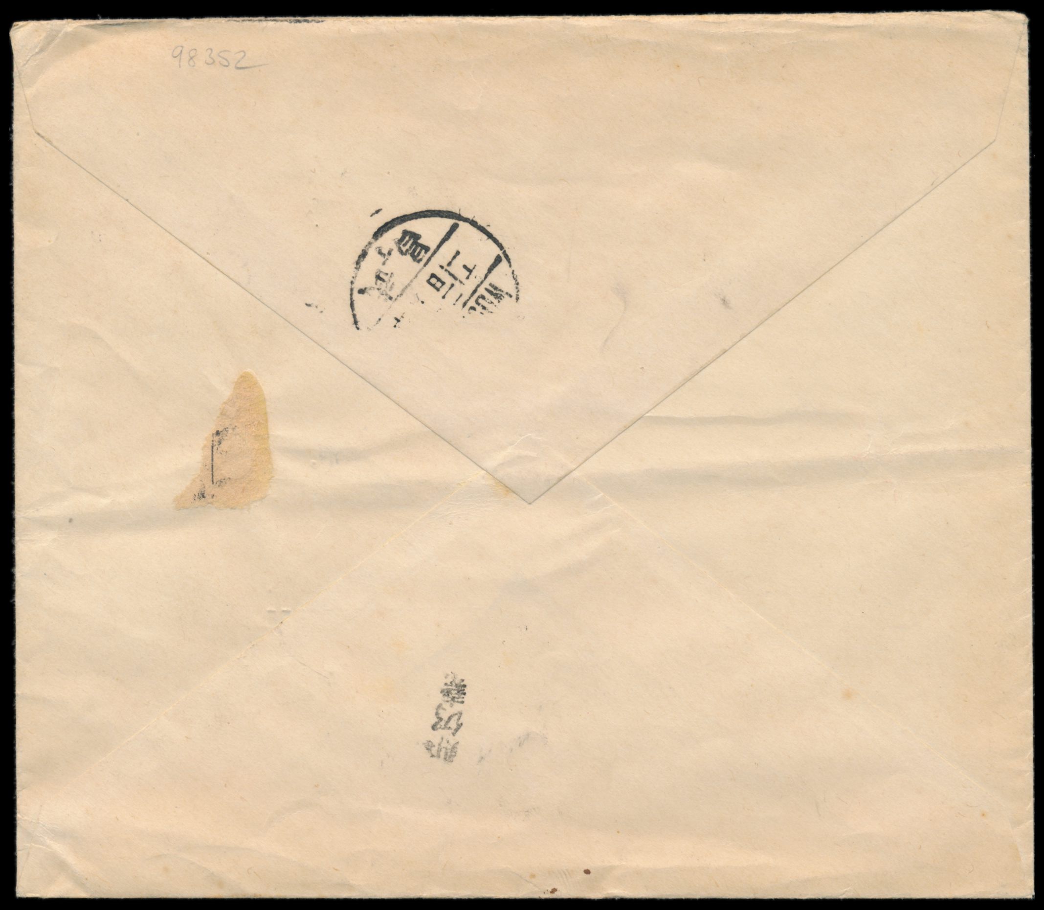 Sinkiang, 5 C. und 10 C. Dschunke und 50 C. Reisernte mit Provinzaufdruck rückseitig auf Einschreibbrief mit Stempel Tihwa / Urumtsi nach Shanghai, rückseitig Fragment des chinesischen Registrierzettels, vorderseitig handschriftlicher R-Vermerk und handschriftlicher Leitvermerk "via Sibirien", Ovalstempel Sinkiang District Commissioner 5.9.1931, Ankunftstempel Shanghai 4.10.20 (1931), Bedarf