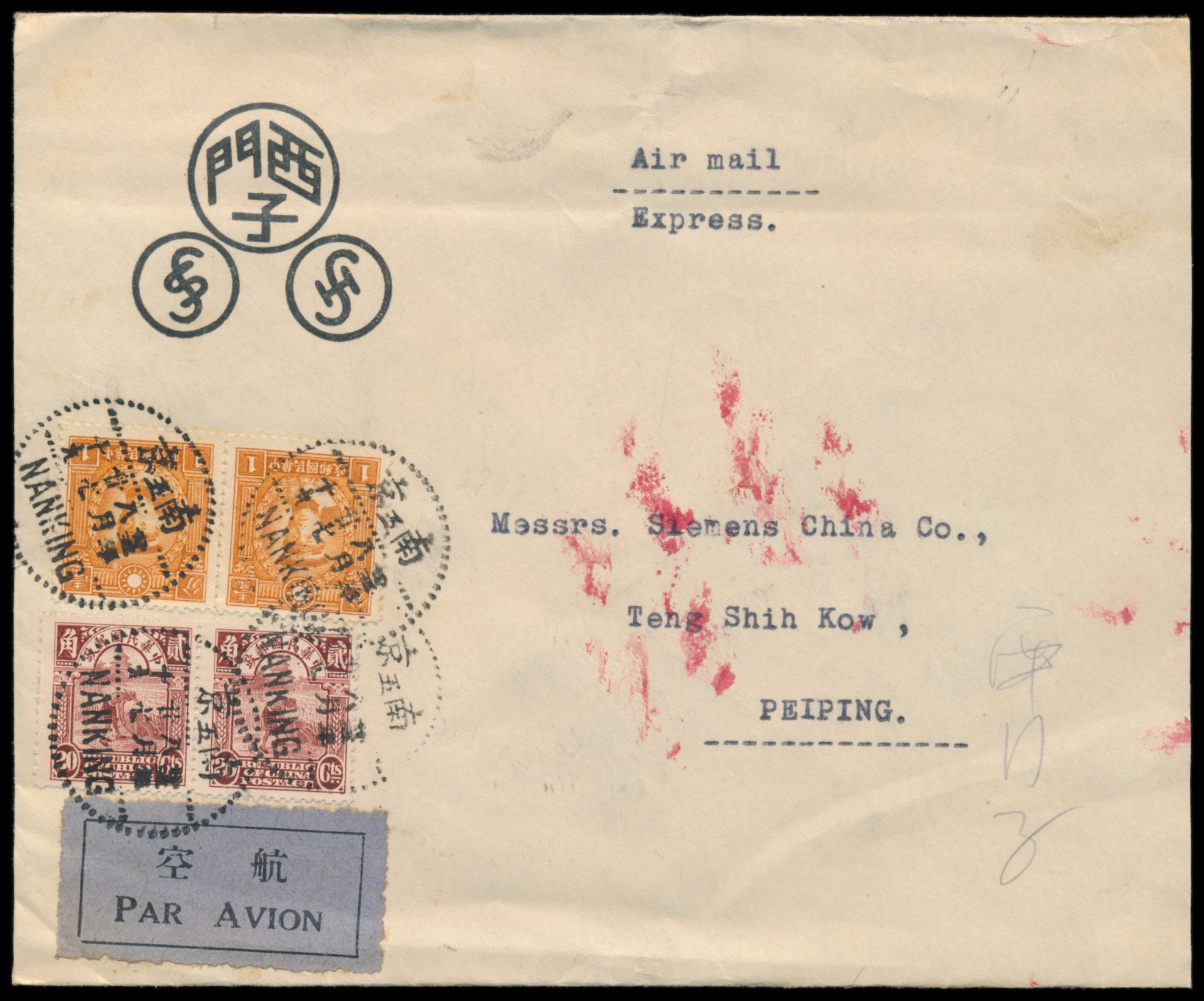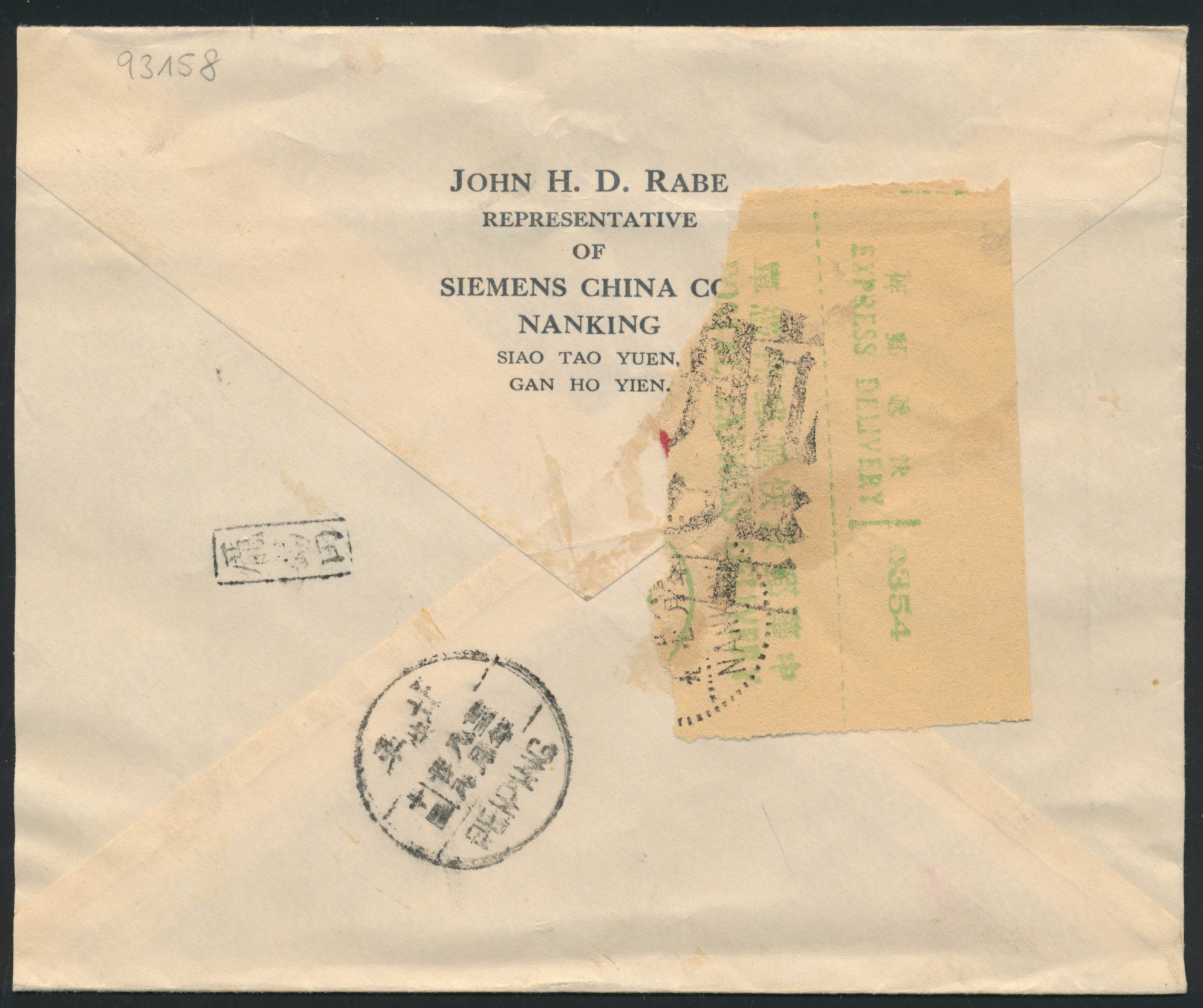 2 x 20 C. Reisernte und 2 x 1 C. Märtyrer auf Luftpost-Express-Brief mit Stempel Nanking nach Peiping, rückseitig Rest des Express-Zettels, Ankunftstempel Peiping, Absender ist "Siemens China Co. Nanking". Bedarf