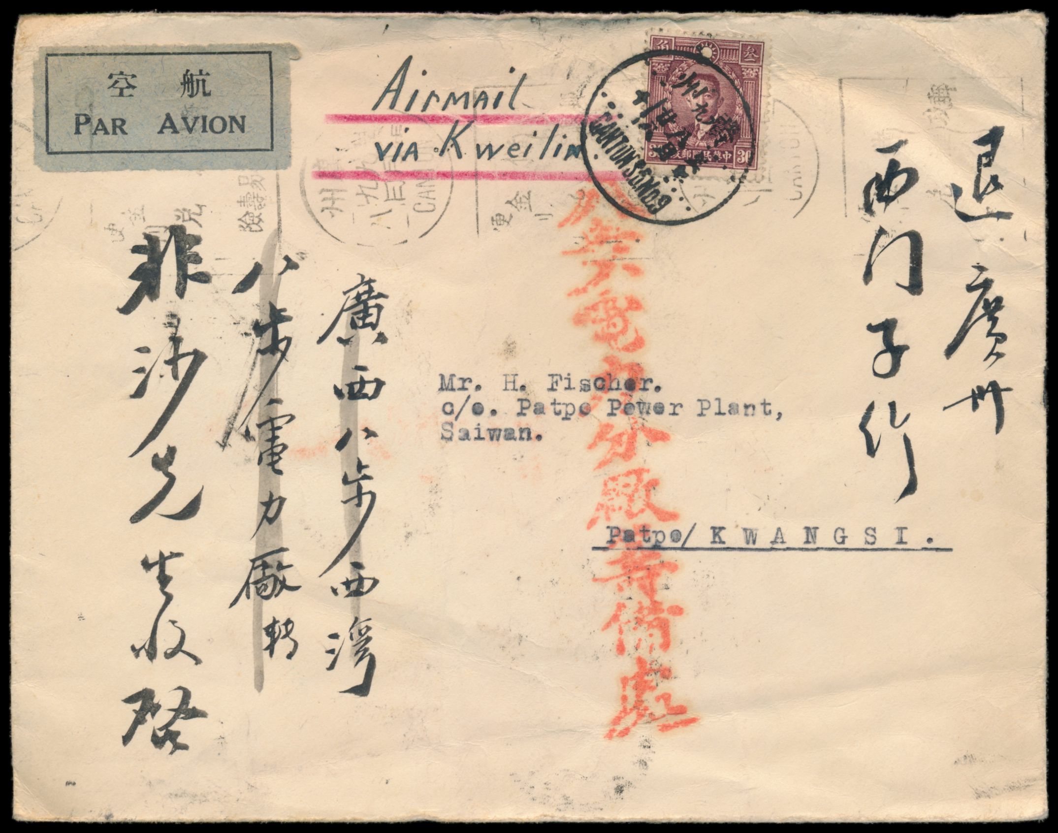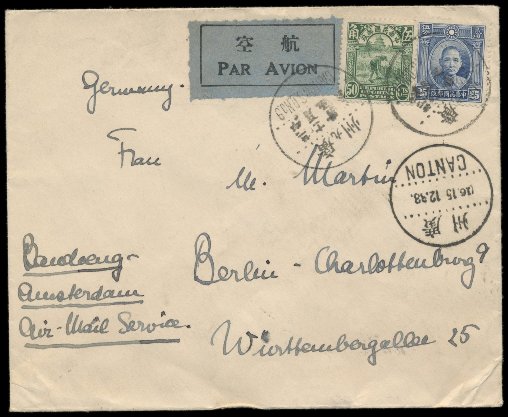 25 und 50 Ct., auf Luftpostbrief Canton 9 (Tungshan) 15.12.33 nach Deutschland, via Bandoeng - Amsterdam, Absender Professor Martin Sun Yatsen University