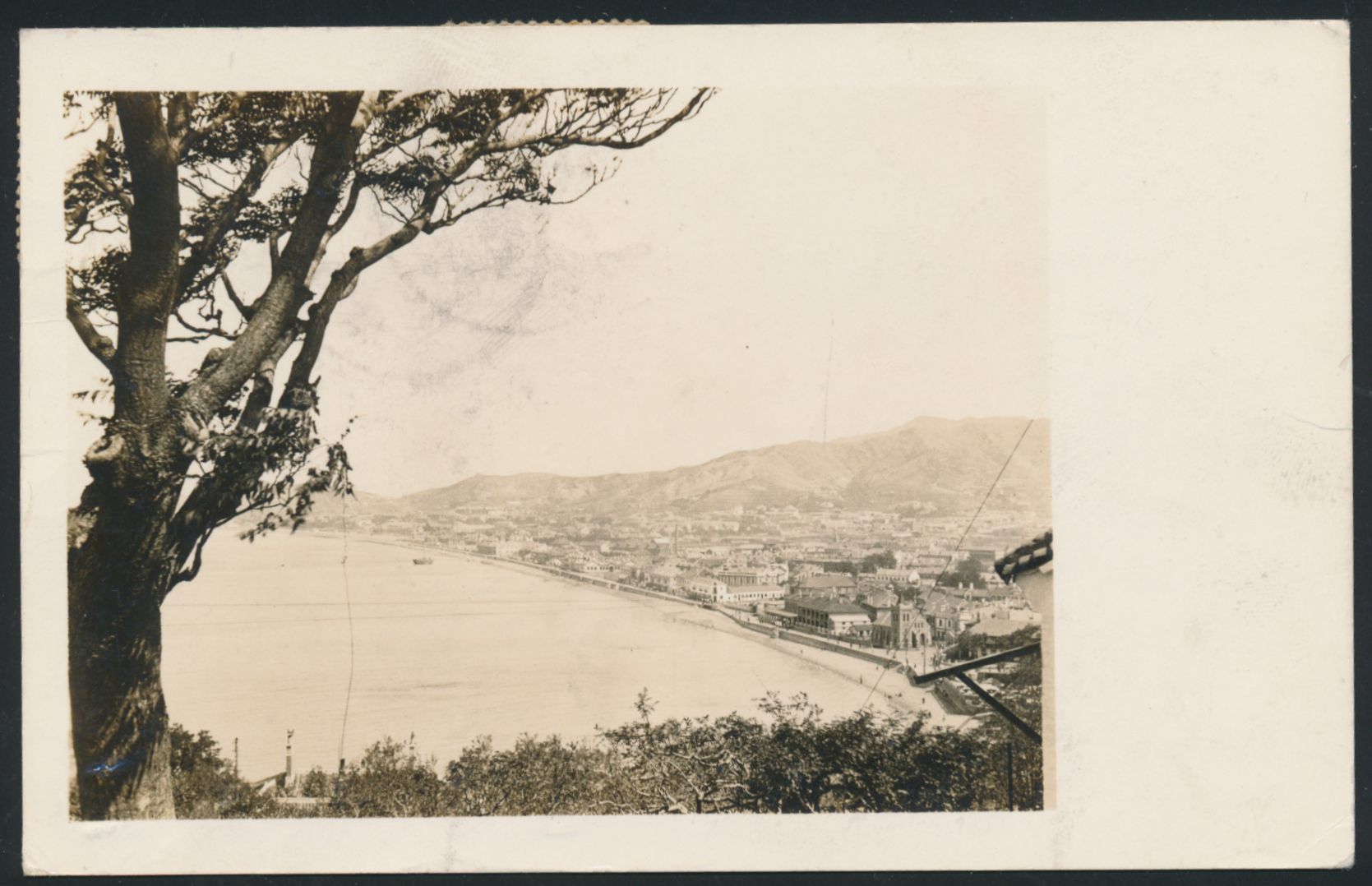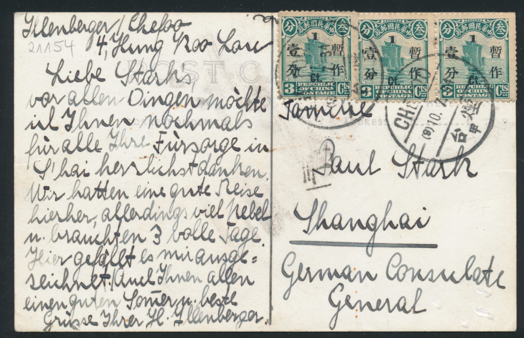 3 x 1 Ct. auf 3 C. Dschunke auf Foto-Ansichtskarte (Panorama von Tschifu), Stempel Chefoo 10.7.34, nach Shanghai