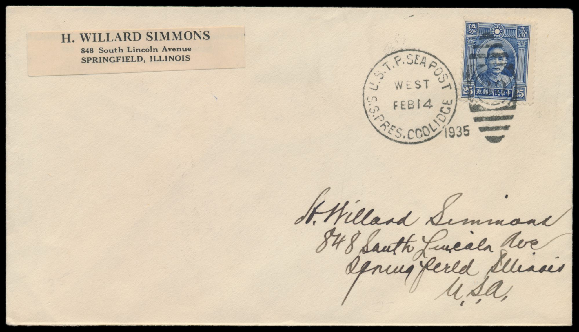 Sun Yatsen 25 C. auf Brief nach USA, USA-Seepoststempel U.S.T.P. Sea Post S.S. Pres. Coolidge mit Killer-Nr. 30 14.2.1935