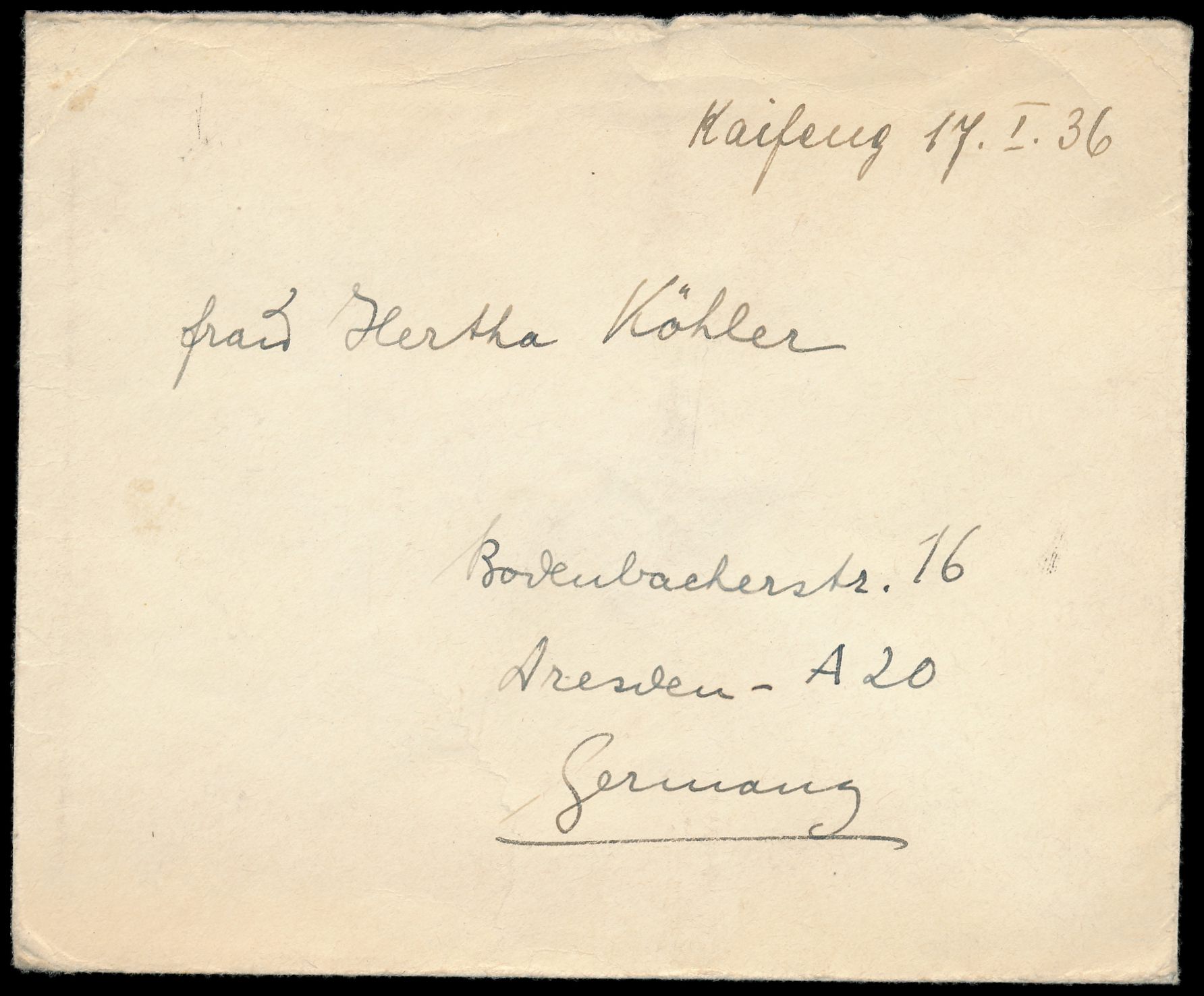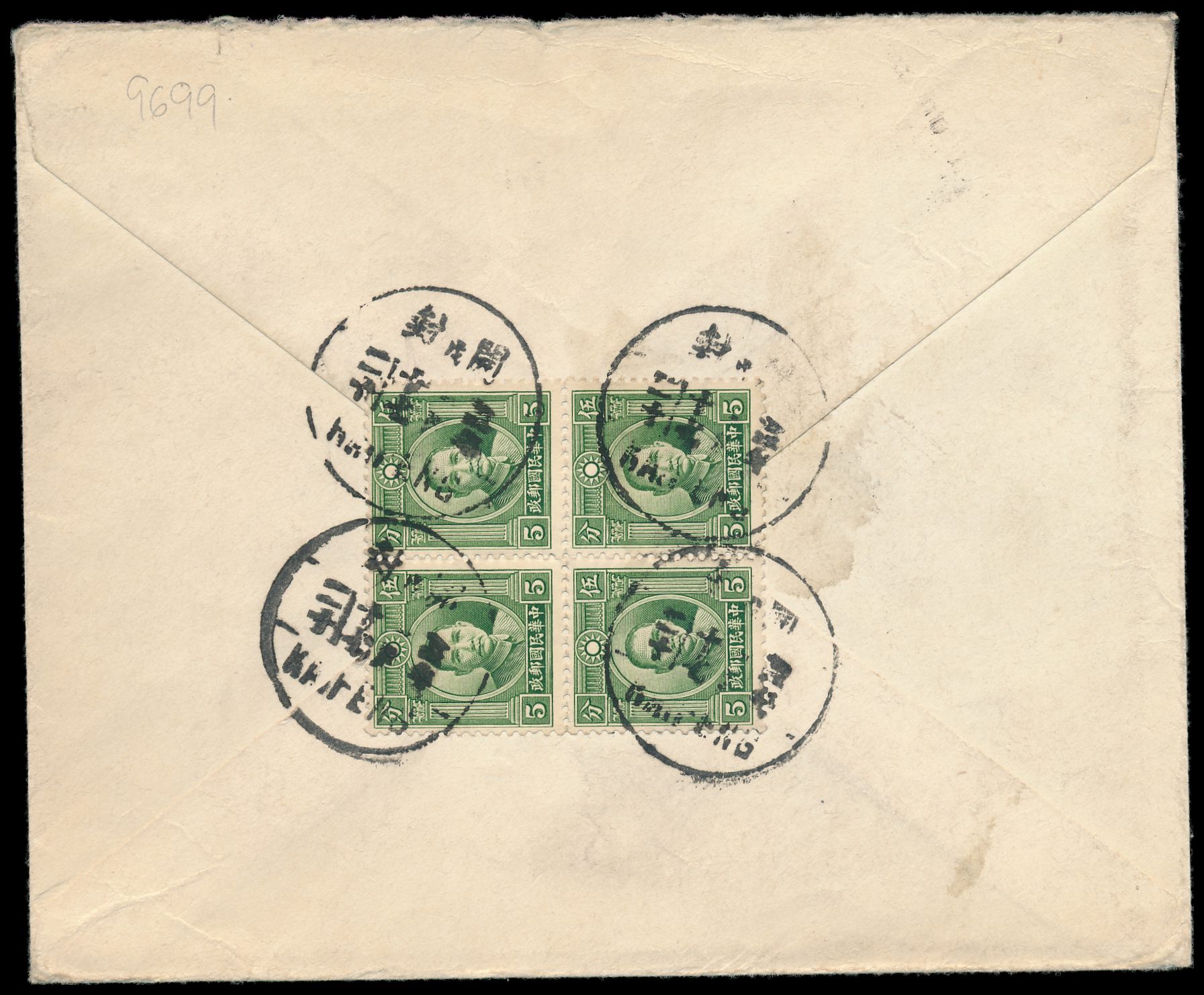 Viererblock 5 C. Sun Yatsen rückseitig auf Brief mit Stempel Kaifeng 17.1.1936 nach Deutschland, Bedarf
