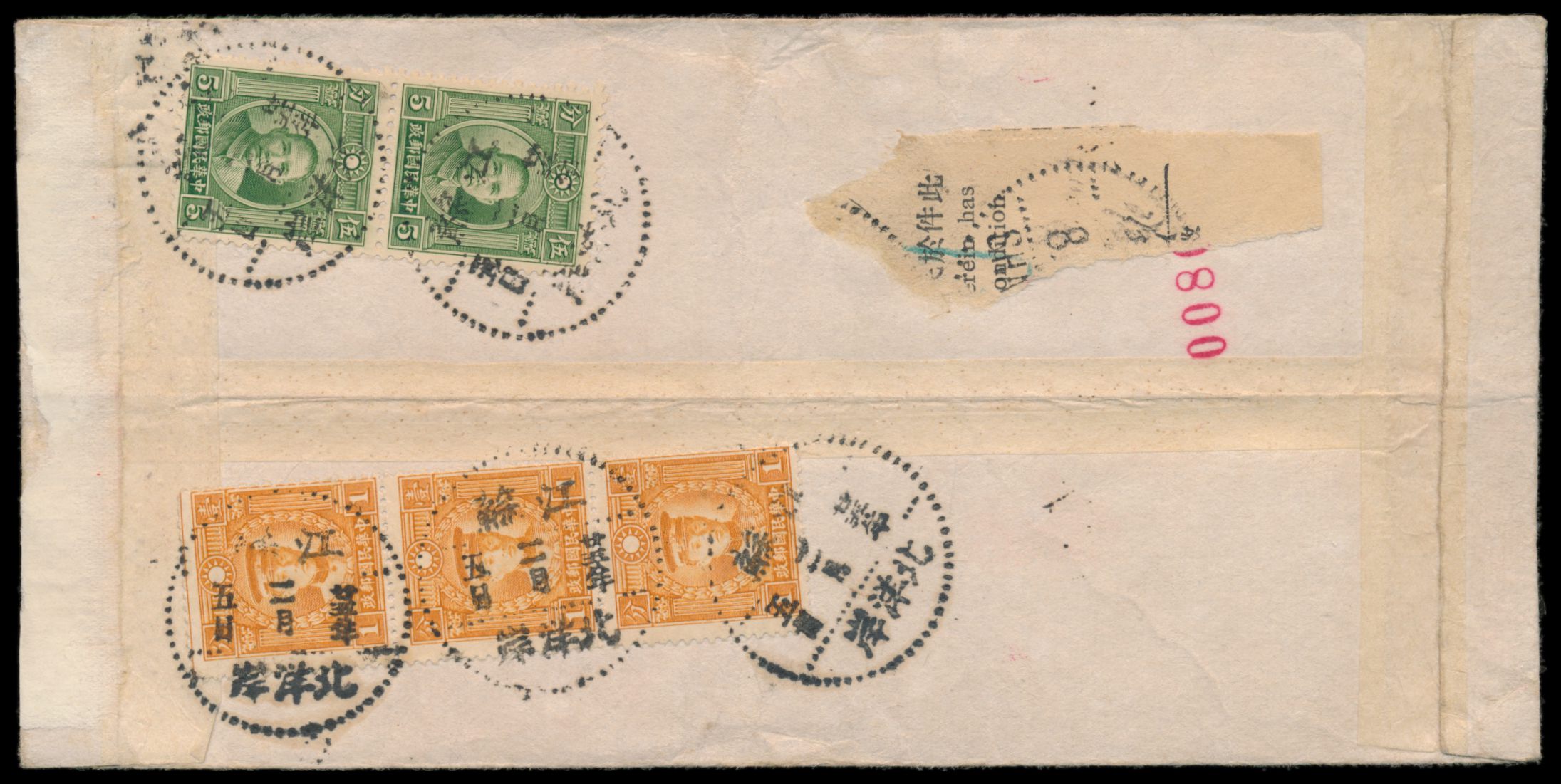 2 x Sun Yatsen 5 C. und 3 x 1 C. Märtyrer rückseitig auf traditionellem chinesischem Umschlag als Einschreiben mit Fragmenten eines Registrierzettels rückseitig und vorderseitig weiterem Registrierzettel, Stempel Anyangbei 5.2.25 (1936) nach Shanghai, Ankunftstempel Shanghai 8.2.25 (1936)