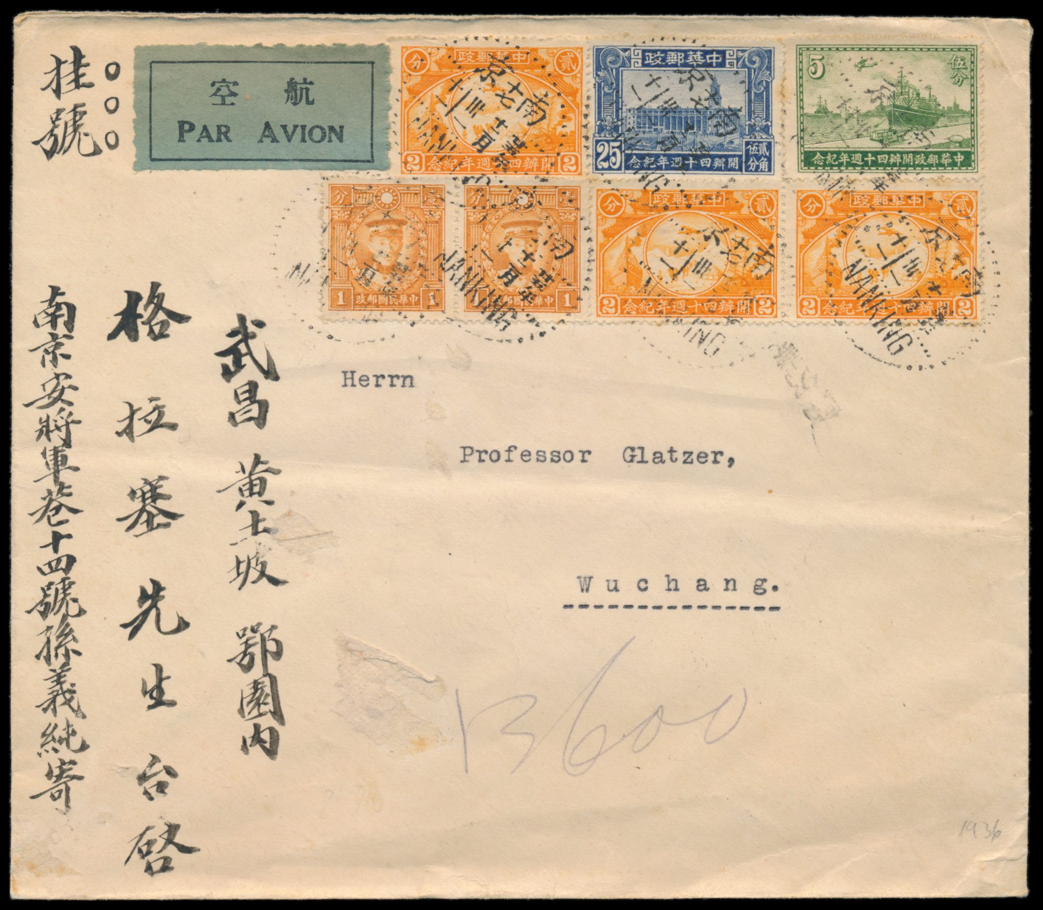1936, 40 Jahre Postwesen 3 x 2 C., 5 C. und 25 C. mit 2 x Märtyrer 1 C. auf Luftpost-Einschreibbrief mit Stempel Nanking nach Wuchang, portorichtig, Bedarf