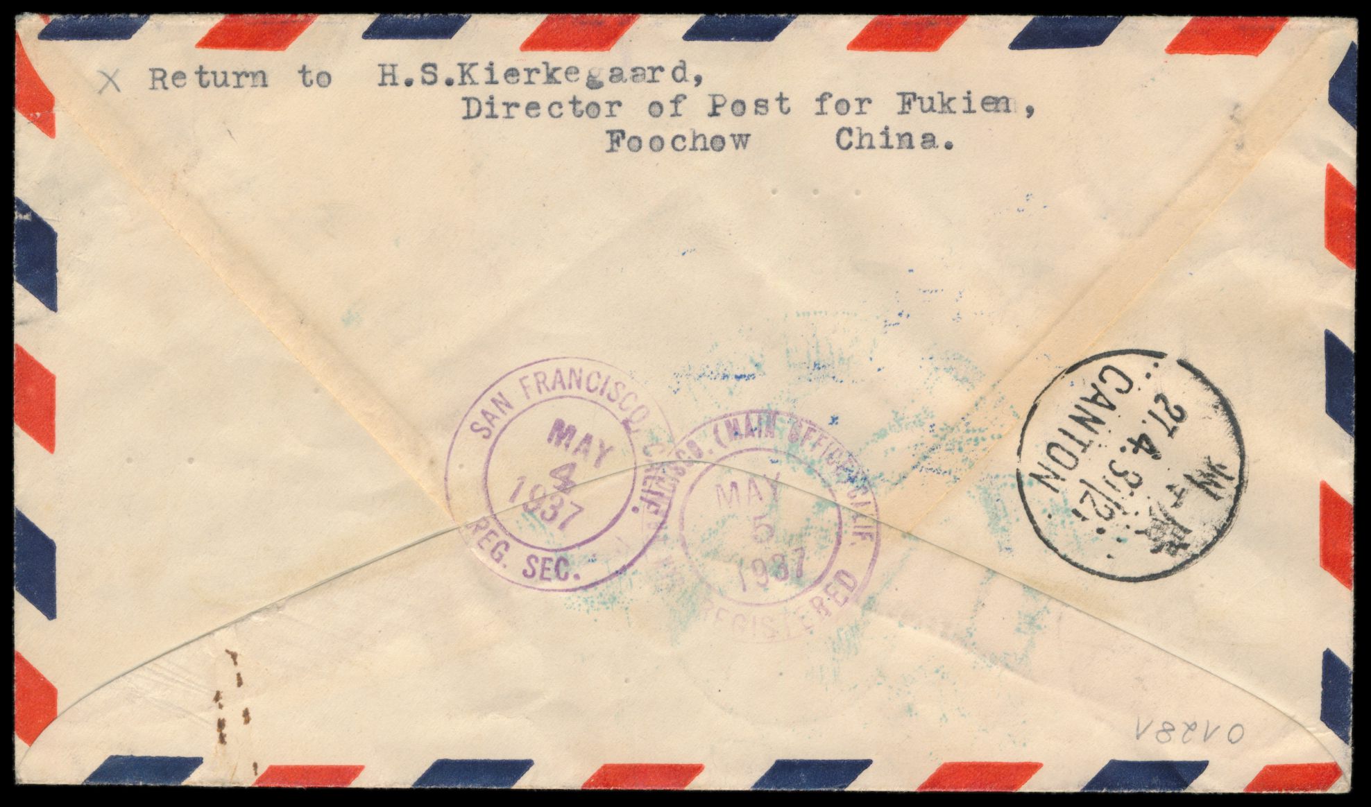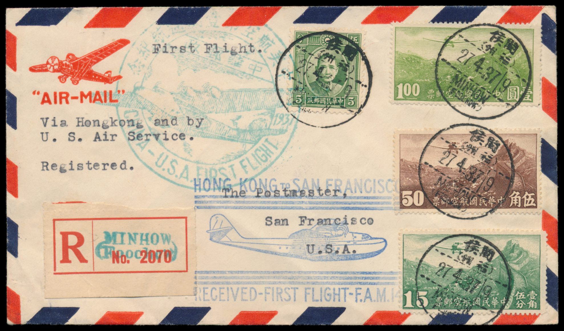 PANAM-Erstflug China - USA via Hong Kong - San Francisco, 5 C. Sun Yatsen mit 15 C., 50 C. und 1 $ Flugpost auf Luftpost-Einschreibbrief, portorichtig, Stempel Minhow (Foochow) 27.4.37, Durchgangsstempel Canton 27.4.37 und Ankunftstempel San Francisco 4.5.37, Erstflug-Bestätigungsstempel in grün und violett