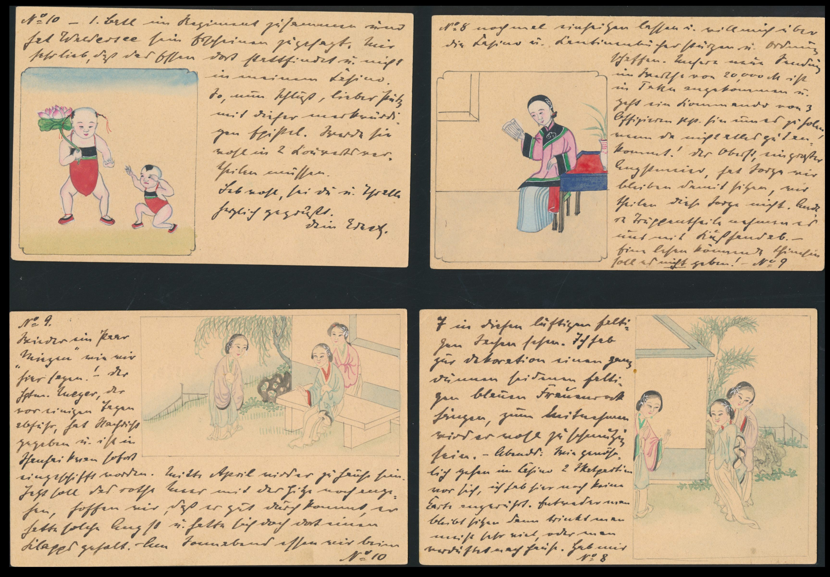 8 nummerierte deutsche Feldpost-Vordruckkarten aus einer Serie ("Brief in Postkarten") von 10 Karten (Nr. 3 und 5 fehlen) mit rückseitig mehrfarbigen Tuschezeichnungen, im Umschlag befördert, mit interessanten Beschreibungen der Abbildungen