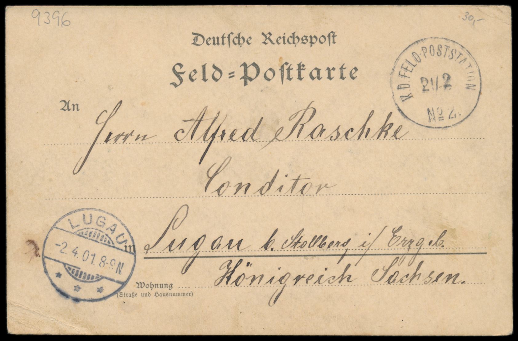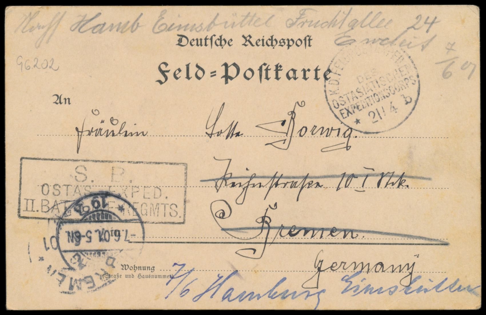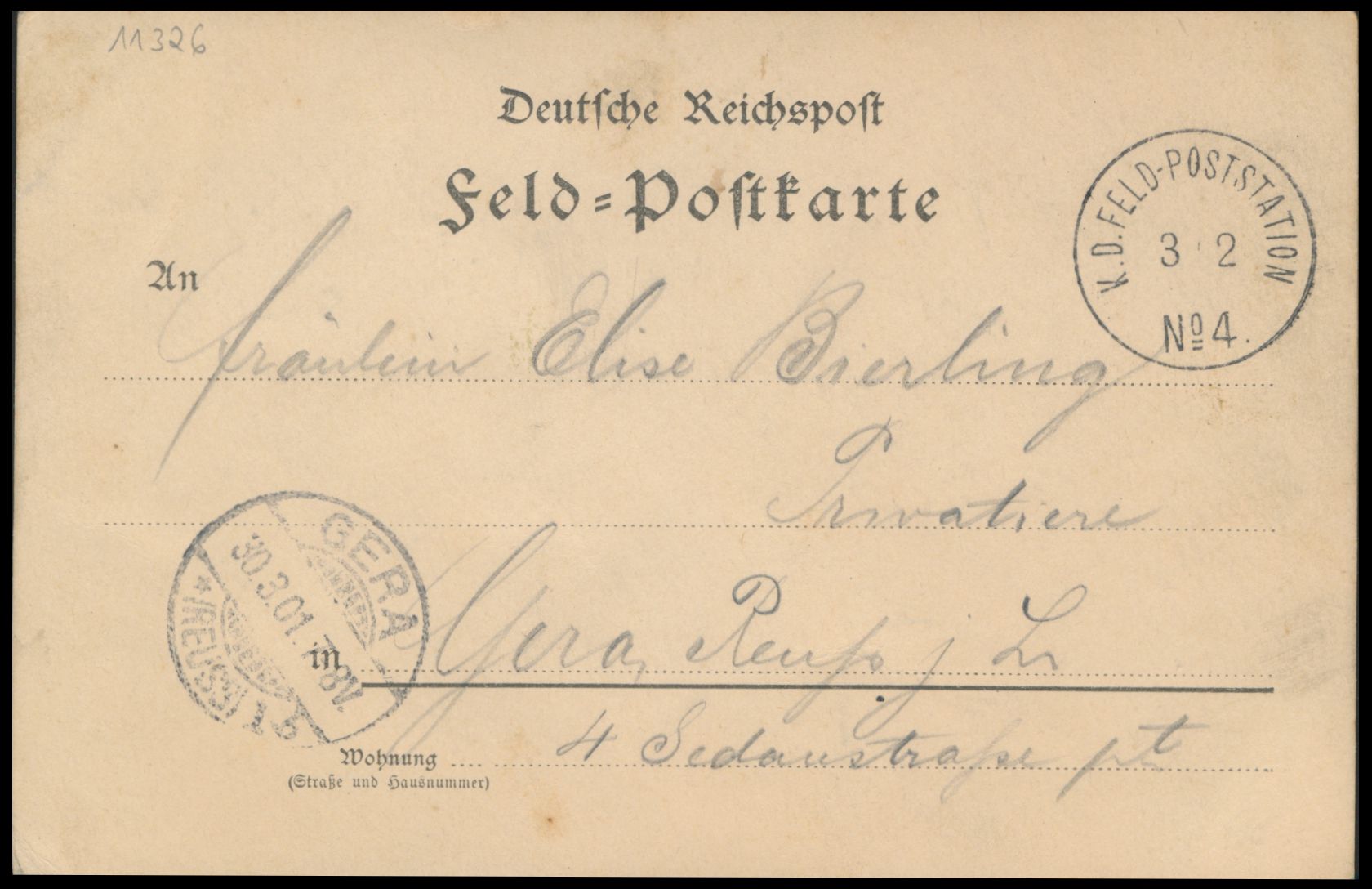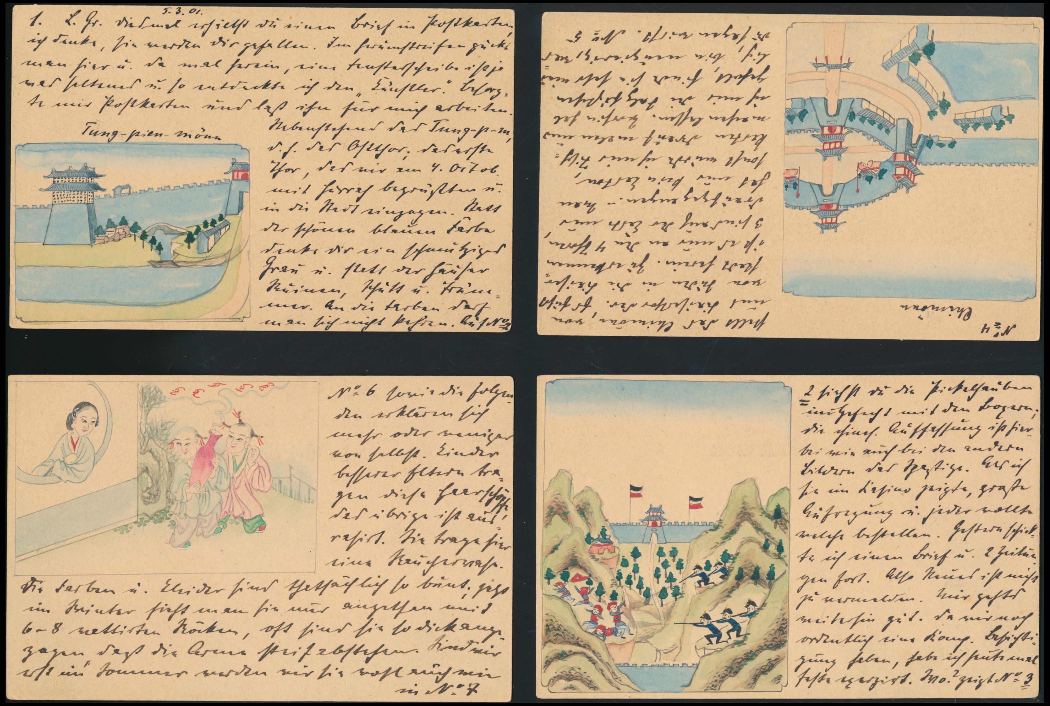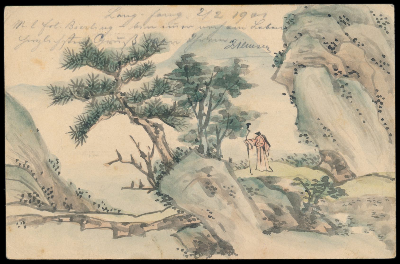 mehrfarbige Tuschezeichnung "Landschaft" ganzflächig auf Rückseite einer deutschen Feldpost-Vordruckkarte, Stempel K. D. Feld-Poststation No. 4 3.2.(1901) in Tongku, nach Deutschland, Ankunftstempel Gera 30.3.01, Bedarf