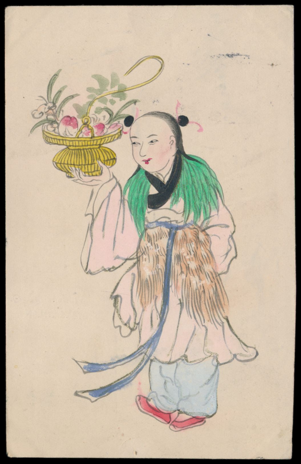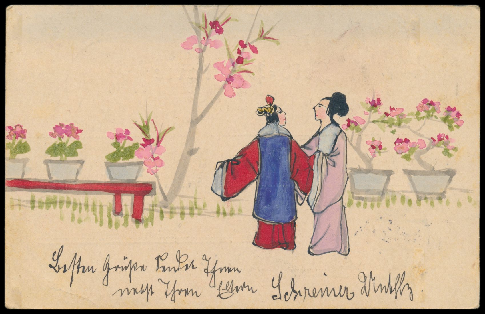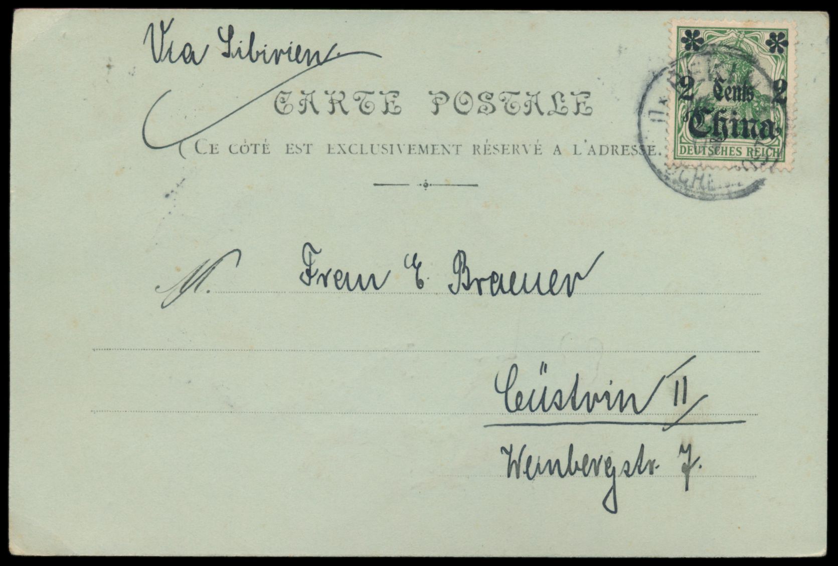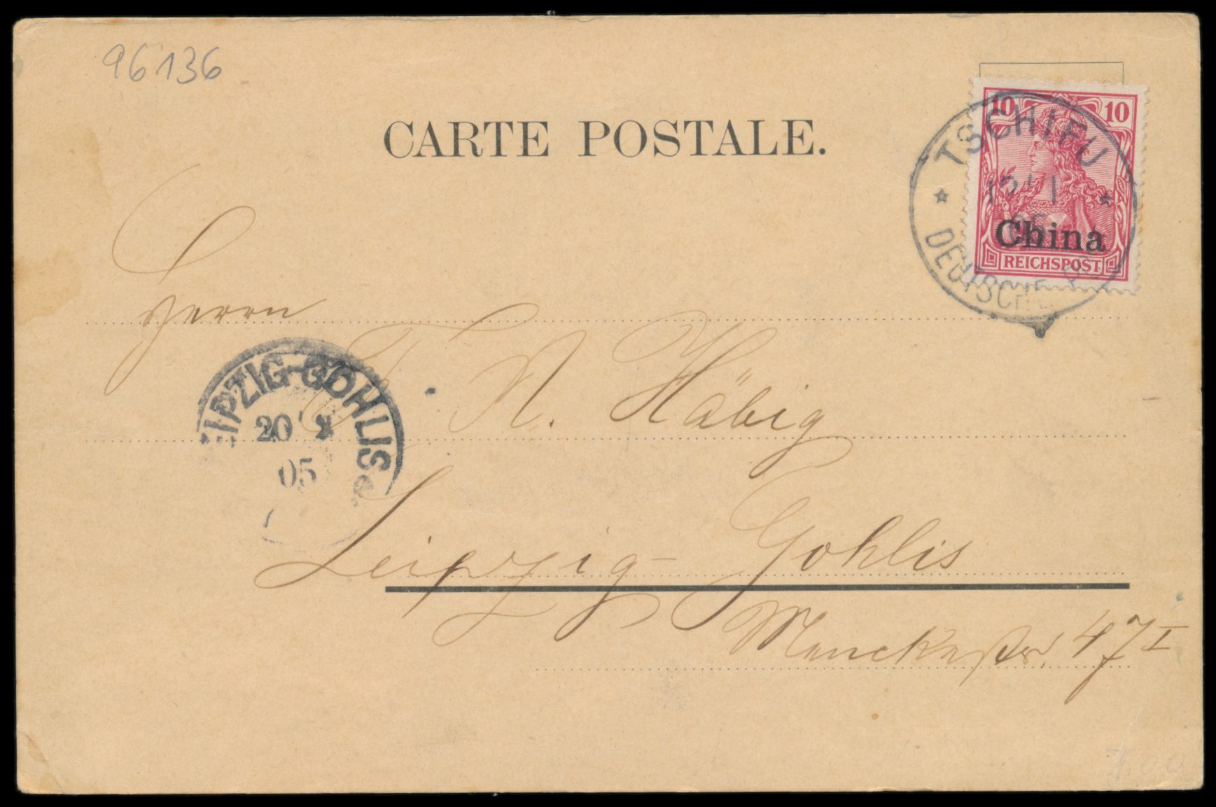 Postkarte mit mehrfarbiger Tuschezeichnung (Märchenszene?), Frankatur Deutsche Post 10 Pf., Stempel Tschifu 12.1.05, nach Deutschland, Ankunftstempel Leipzig 20.2.05, Bedarf
