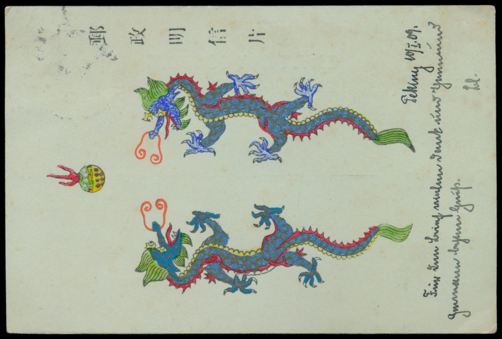 Ansichtskarte mit mehrfarbiger Tuschezeichnung (2 Drachen), Frankatur Deutsche Post 2 C., Stempel Peking 10.1.09, nach Deutschland, Bedarf