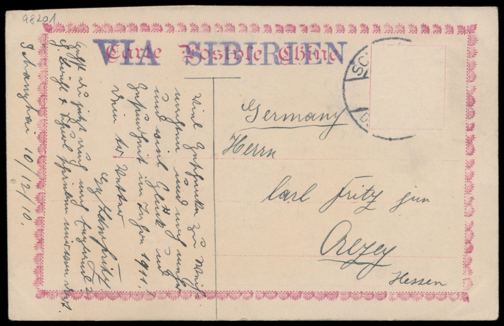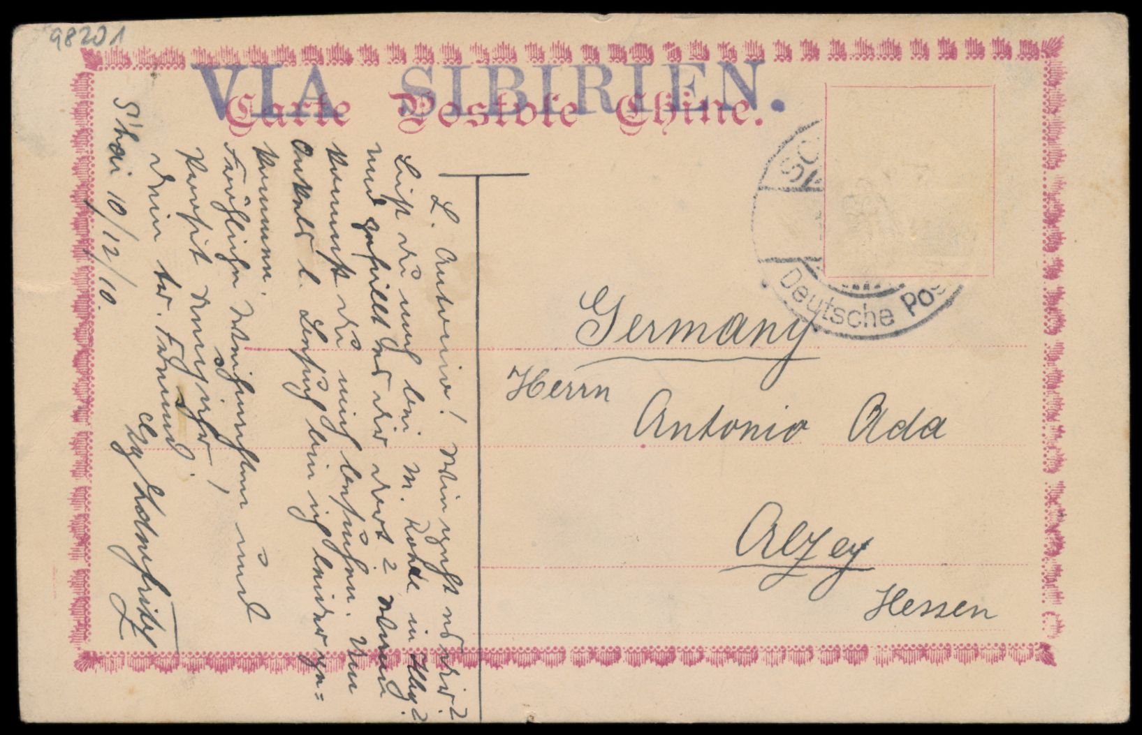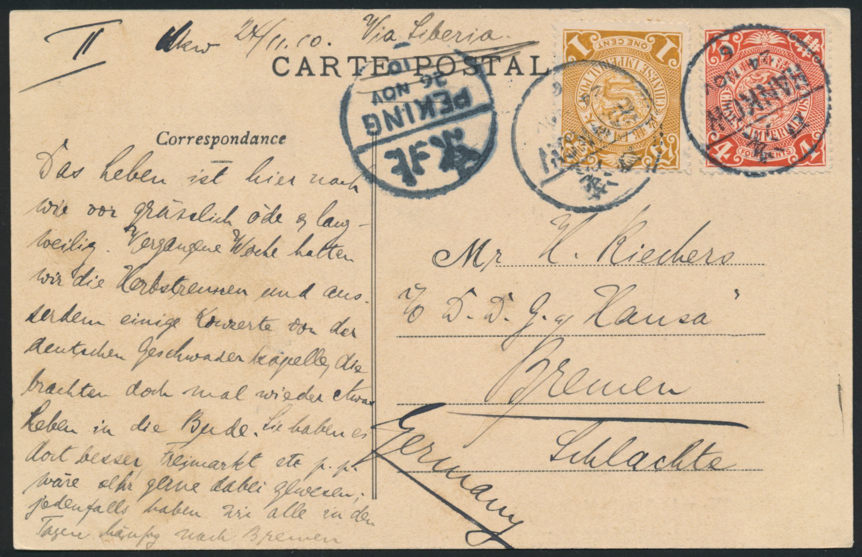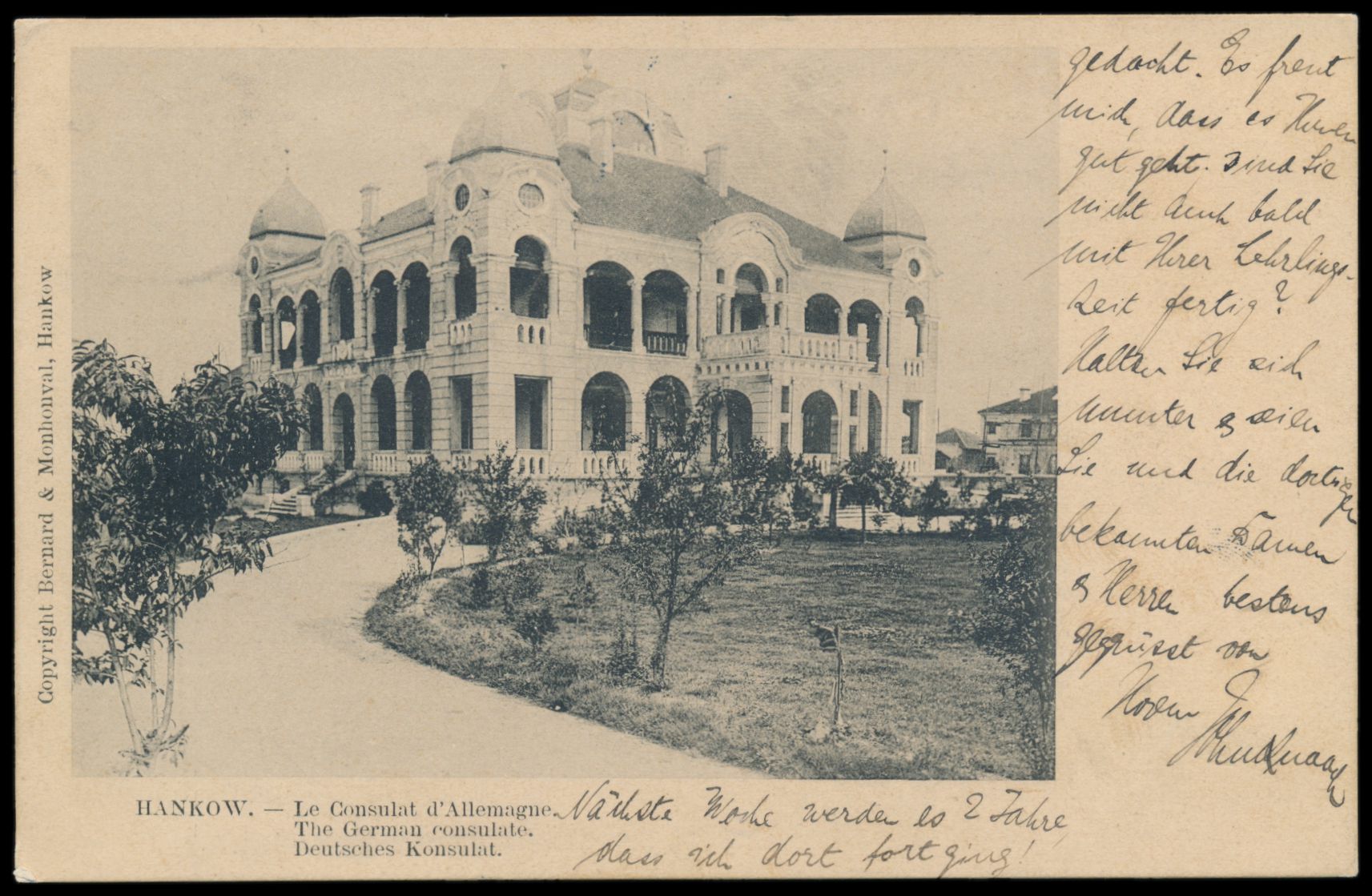 Ansichtskarte Hankow - Deutsches Konsulat, Verlag Bernard & Monhonval, Hankow, nach Deutschland, Frankatur C.I.P. 1 C. und 4 C. rot, Stempel Hankow 24.11.10, Leitvermerk "Via Sibirien", Durchgangsstempel Peking 26.11.10, Bedarf