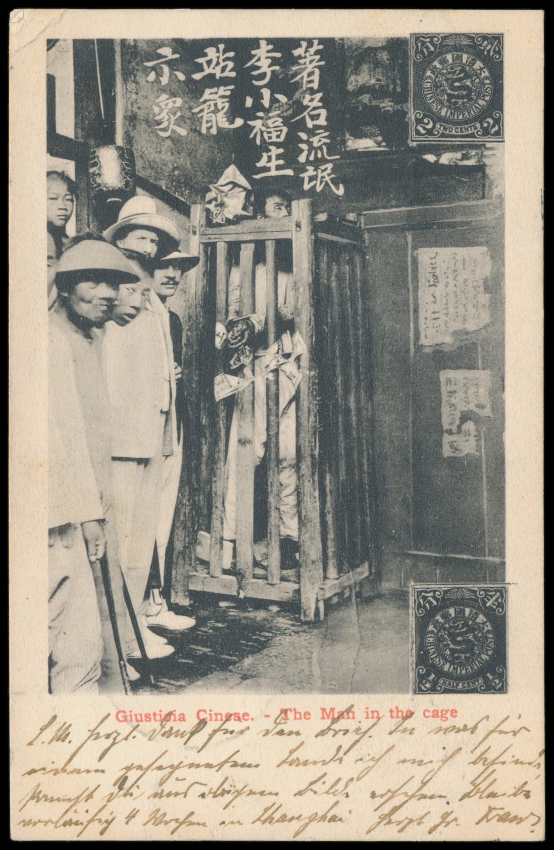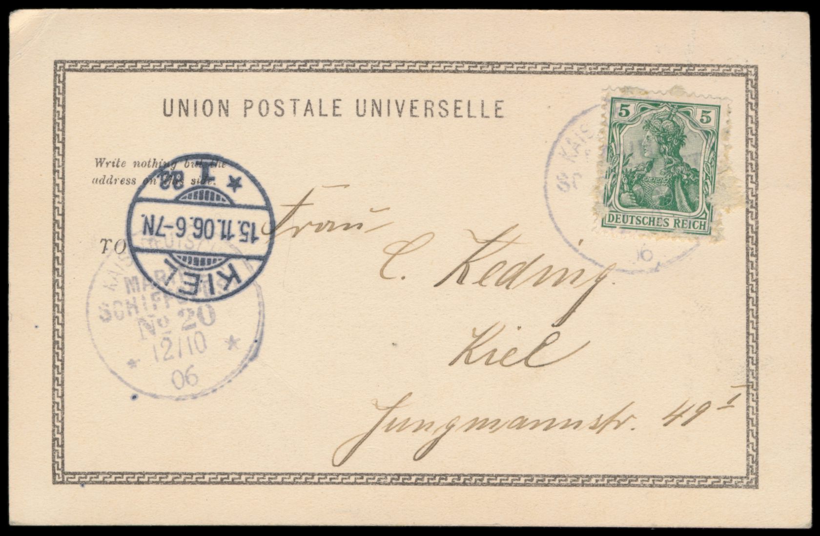 Ansichtskarte "Chinese Justice - The Man in the Cage" , Frankatur Deutsches Reich 5 Pf. (kleine Papieranhaftungen), Stempel Kais. Deutsche Marine-Schiffspost No. 20 12.10.06, S.M.S. Iltis, nach Deutschland, Ankunftstempel Kiel 15.11.06, Bedarf