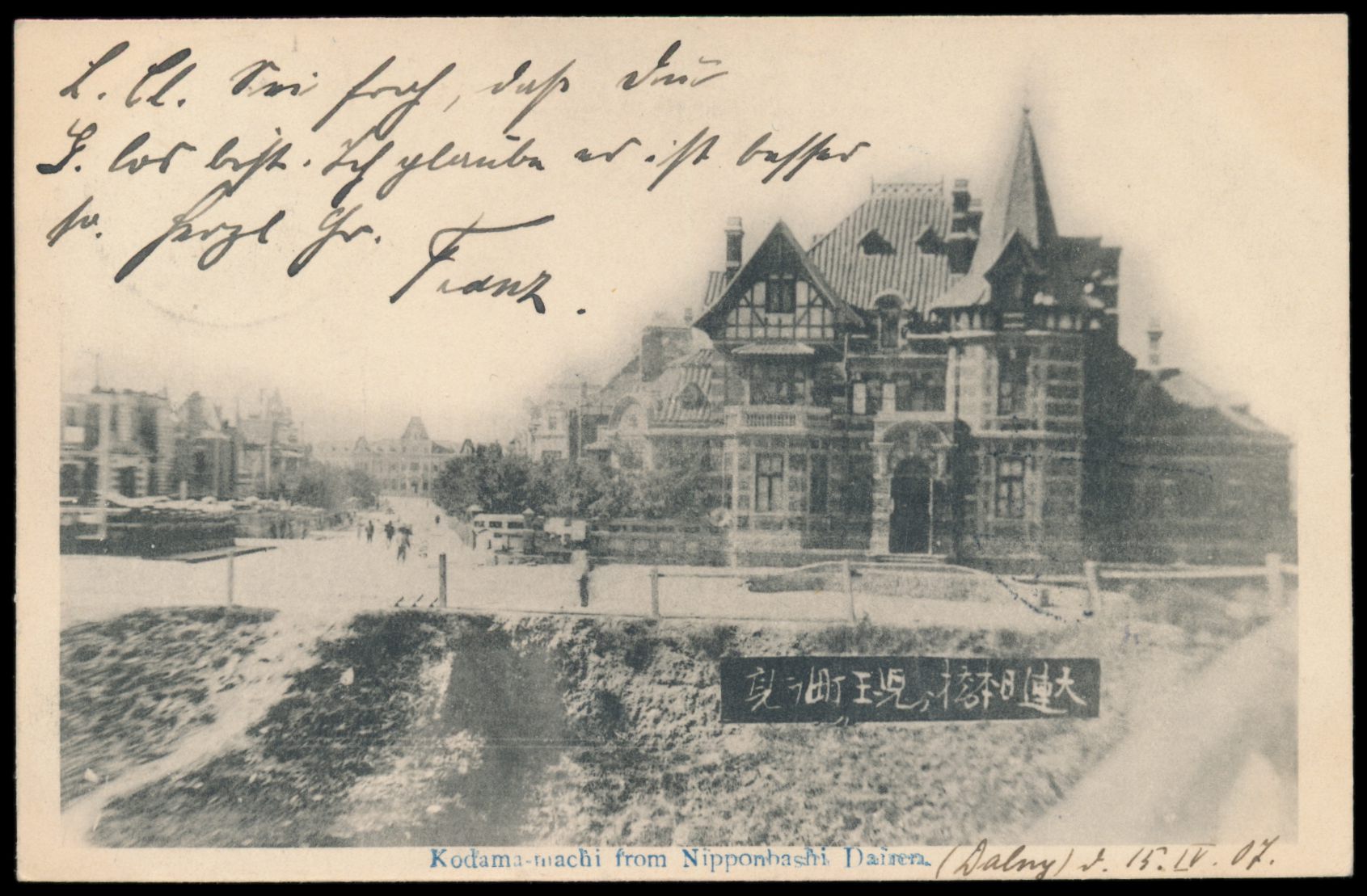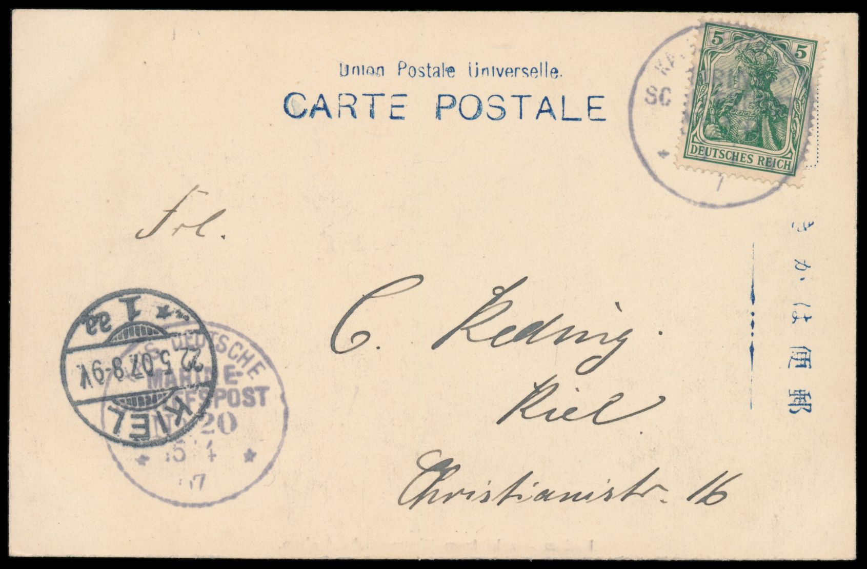 Ansichtskarte Dairen - Kodama-machi from Nipponbashi, Frankatur Deutsches Reich 5 Pf., Stempel Kais. Deutsche Marine-Schiffspost No. 20 15.4.07, S.M.S. Iltis, nach Deutschland, Ankunftstempel Kiel 22.5.07