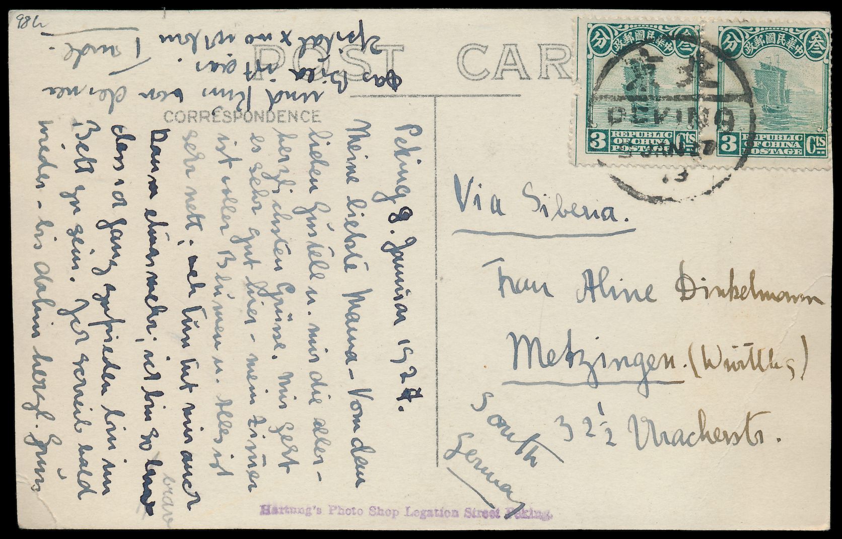Peking, Foto-Ansichtskarte "Spital" laut Kartentext, Frankatur 2 x 3 C. Dschunke, Stempel Peking 9.1.37 nach Deutschland, Bedarf