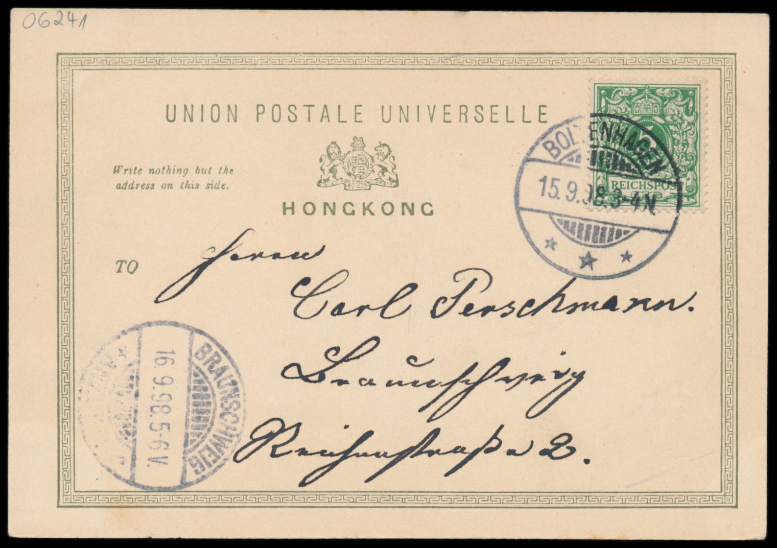 Shanghai, seltene frühe kolorierte Ansichtskarte (Kleinformat) "Shanghai. The Bund" , Vordruck "Hongkong", verwendet innerhalb Deutschlands, Frankatur Deutsches Reich 5 Pf., Stempel Boltenhagen 15.9.98, nach Braunschweig, Bedarf
