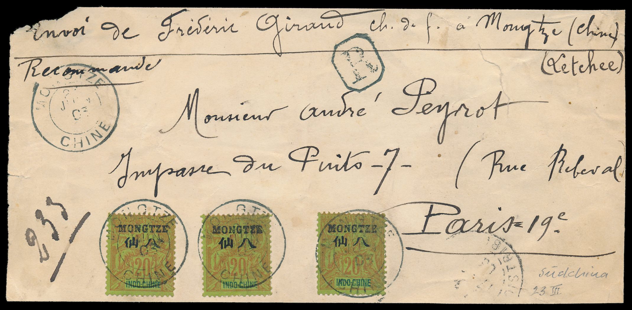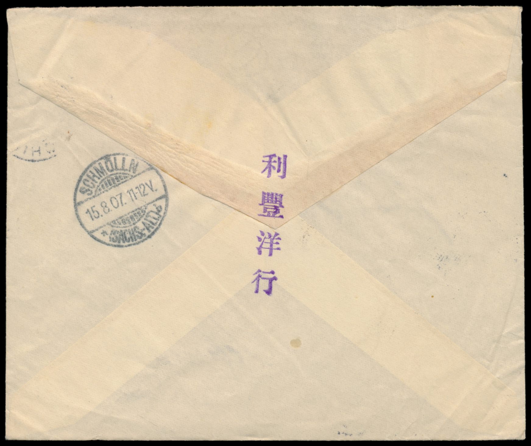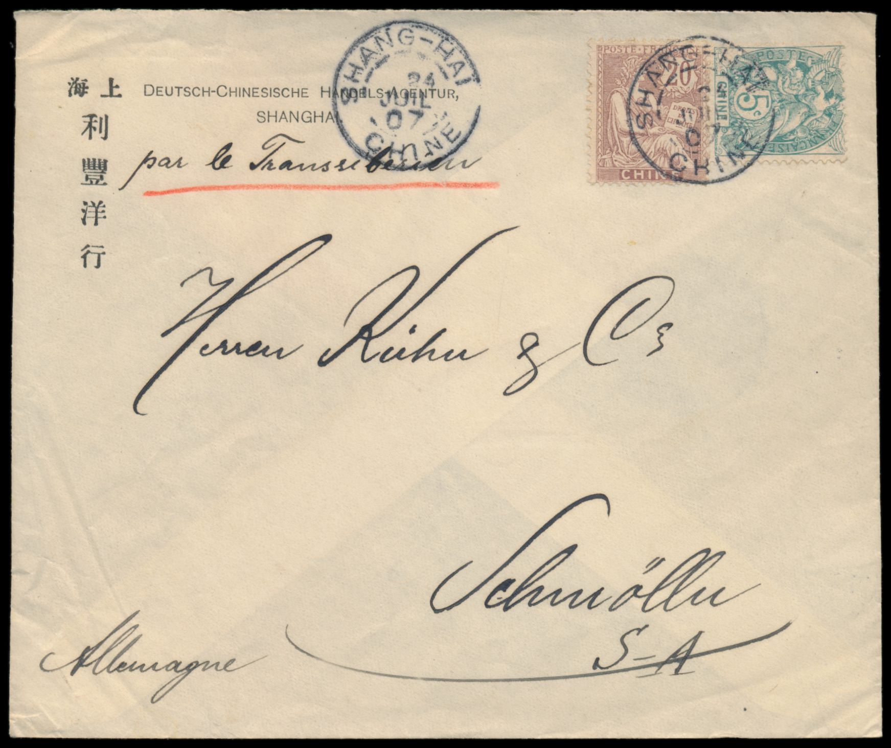 Französische Post, 5 C. und 20 C. auf Brief mit Stempel Shang-Hai 24.7.07 "via Sibirien" nach Deutschland, vorderseitig zweisprachiger Absendereindruck "Deutsch-Chinesische Handels-Agentur Shanghai" , Ankunftstempel Schmölln 15.8.07, Bedarf