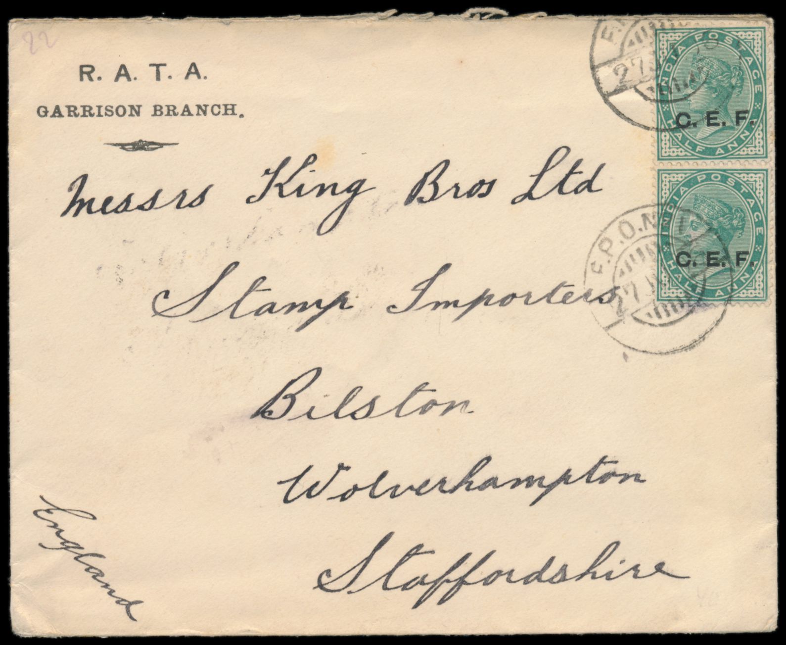 Indien: 2 x C.E.F. QV 1/2 Anna auf Brief mit vorderseitigem Absendereindruck "R.A.T.A. / Garrison Branch" nach England, Stempel F.P.O. No. 1 27.6.06 (Peking), Durchgangstempel Base Office B 27.6.06, Ankunftstempel Bilston 10.8.06