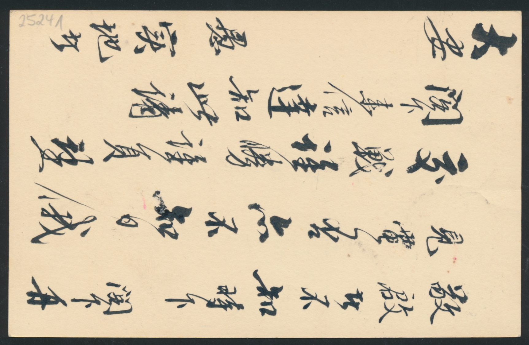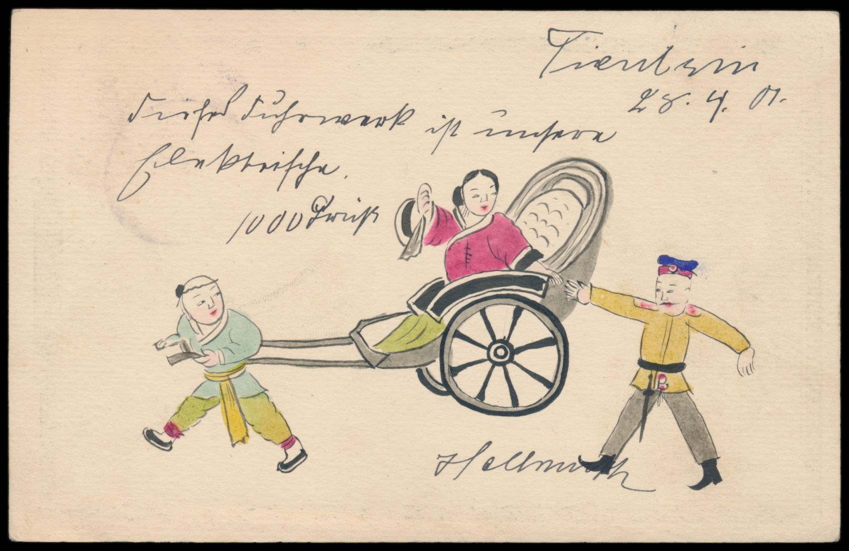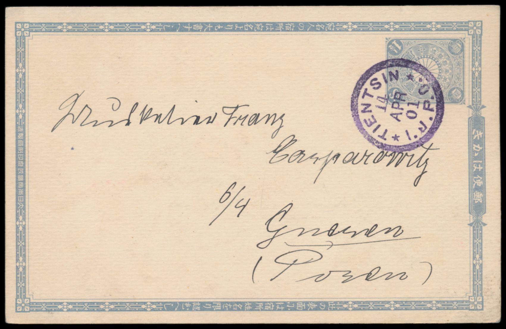 Japanische Post, Ganzsache 1 1/2 Sen mit rückseitig mehrfarbiger chinesischer Tuschezeichnung, Stempel Tientsin I.J.P.O. 14.4.01, nach Deutschland