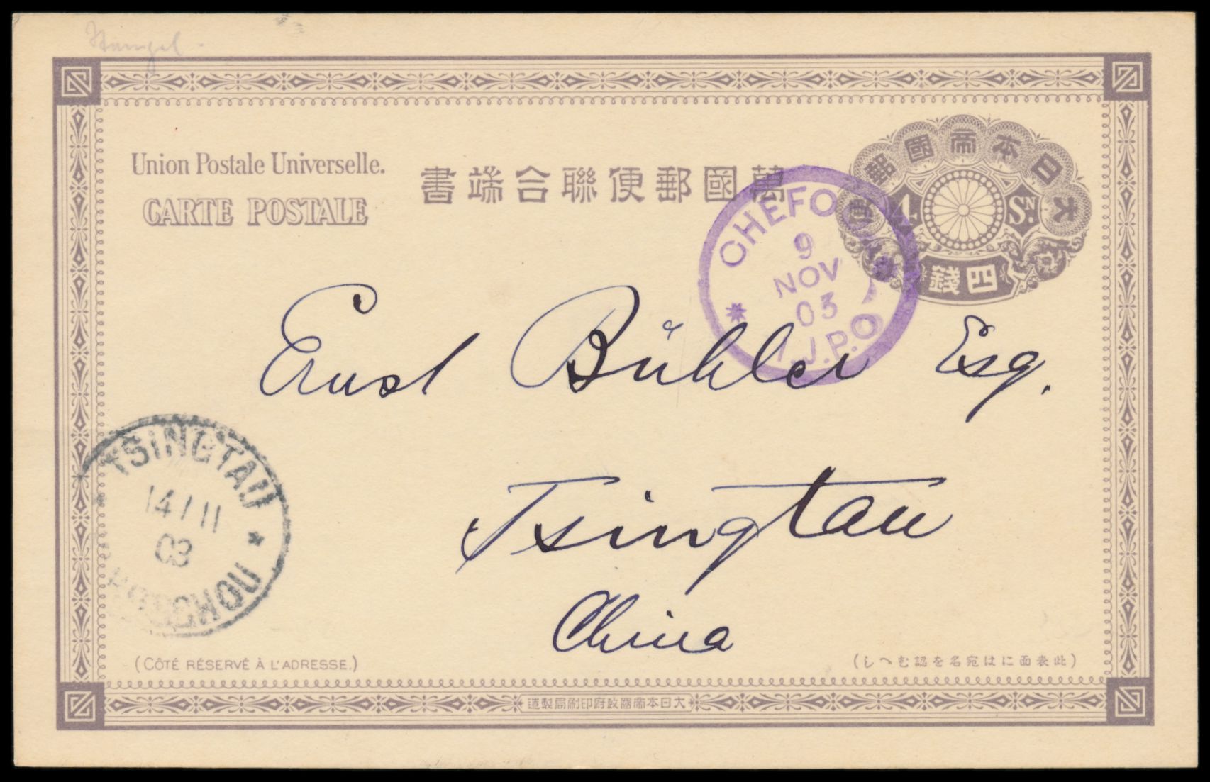 Japanische Post, Ganzsache 4 Sen mit violettem Stempel Chefoo I.J.P.O. 9.11.03 nach Tsingtau, Ankunftstempel 14.11.03, japanischer Text