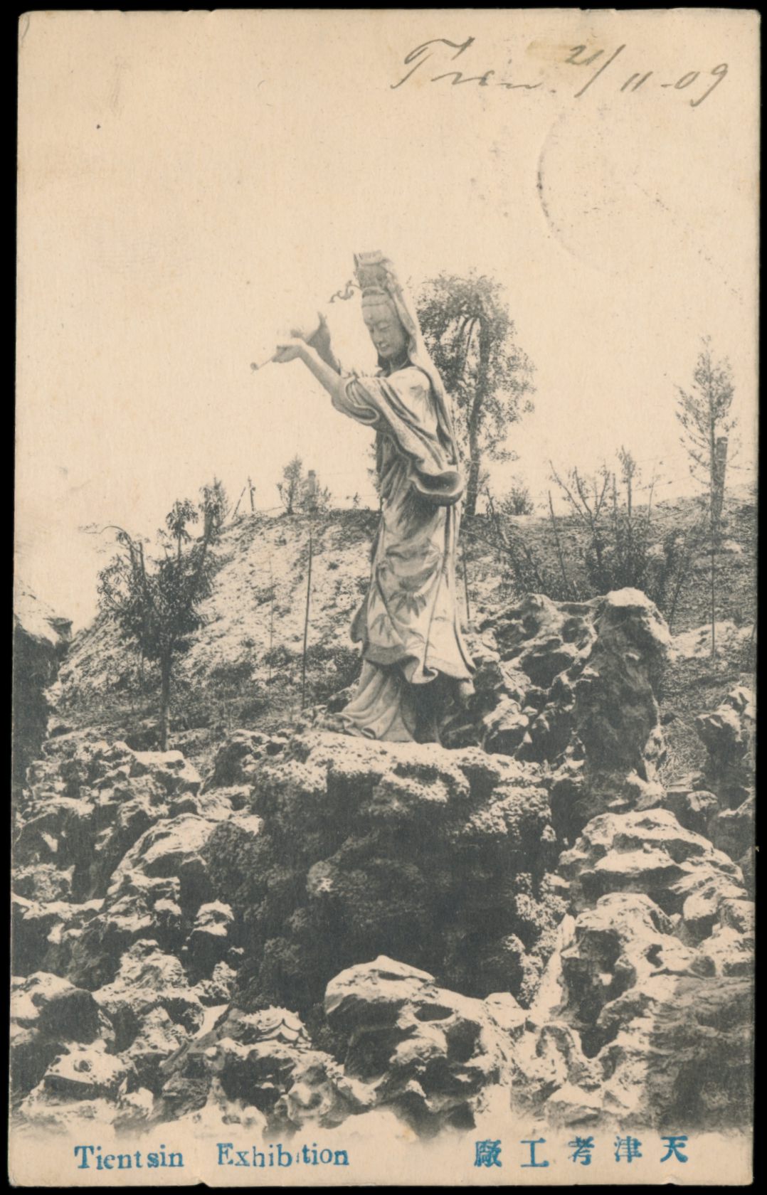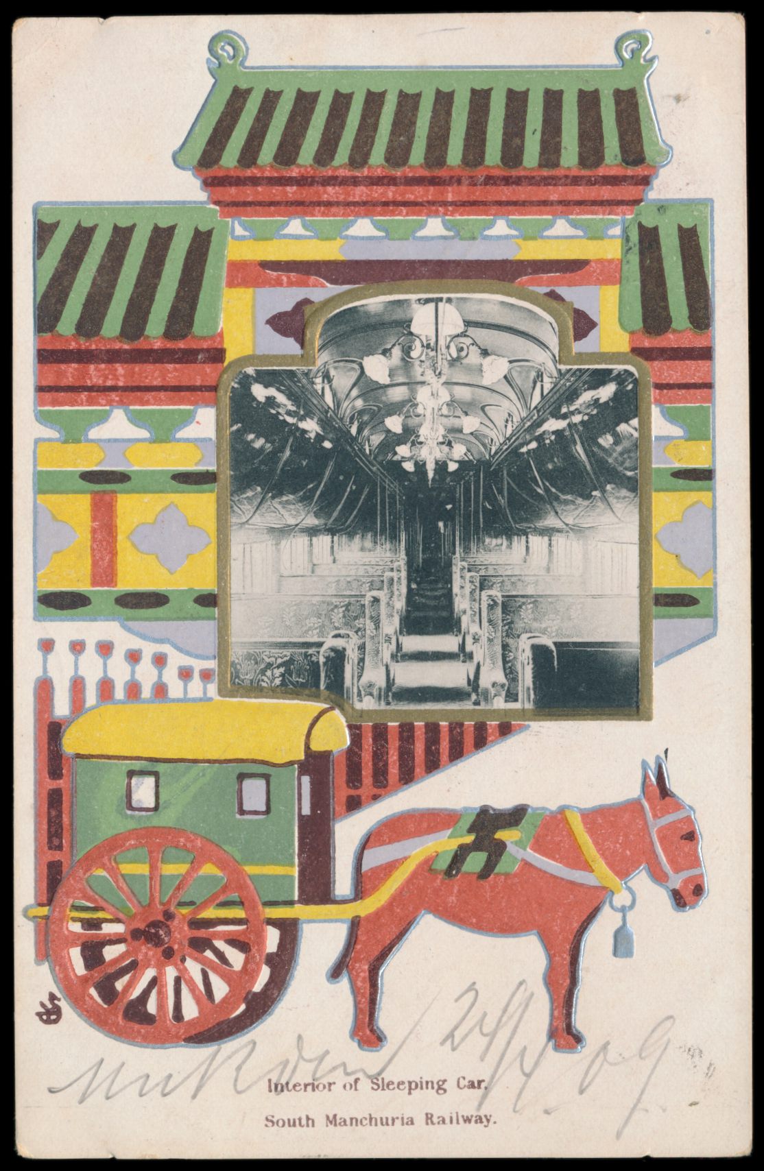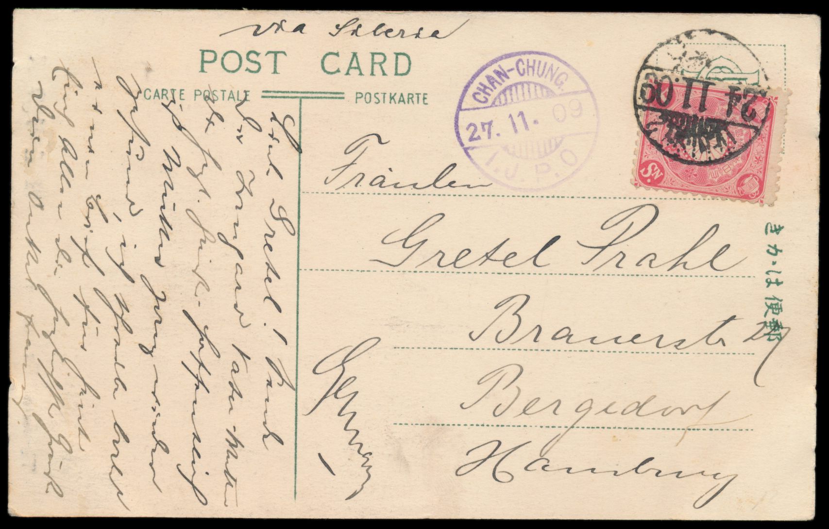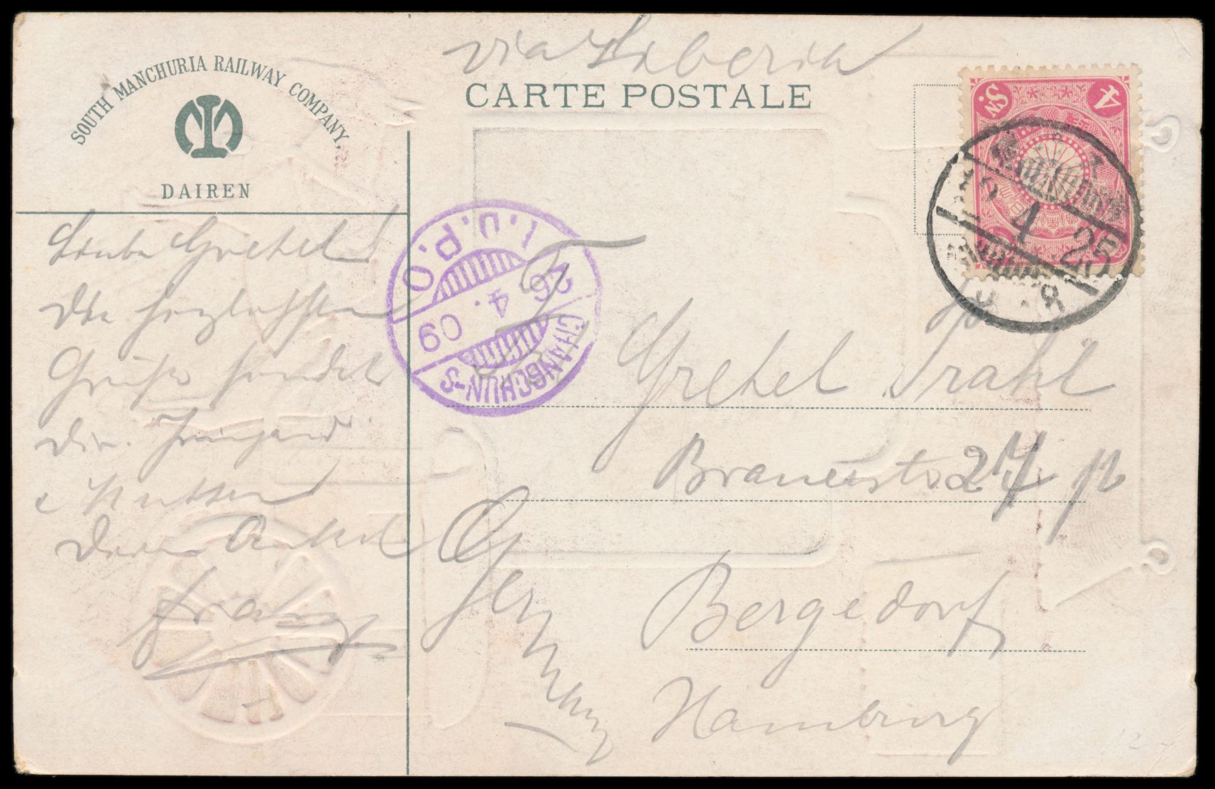 Japanische Post: zwei Ansichtskarten (Tientsin Exhibition und South Manchuria Railway) mit Japan 4 Sen (Kiku-Serie) via Sibirien nach Deutschland, 1 x Stempel Tientsin 2 24.11.09 und Durchgangsstempel Chang-Chung I.J.P.O. 27.11.09, 1 x japanischer Stempel Mukden (?) 25.4.1909 und Durchgangsstempel Changschun-S I.J.P.O. 26.4.09, Bedarf