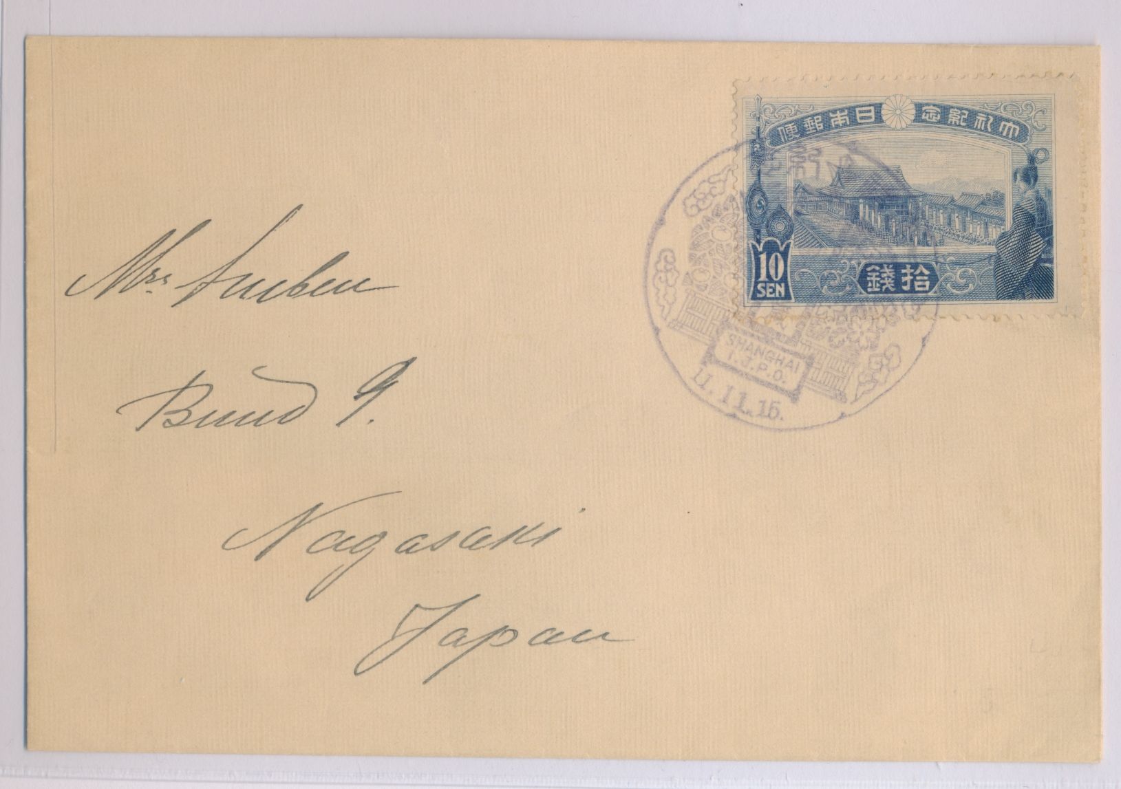 Japanische Post, Sondermarke "Kaiserkrönung" 10 Sen mit Sonderstempel Shanghai 11.11.1915 nach Nagasaki