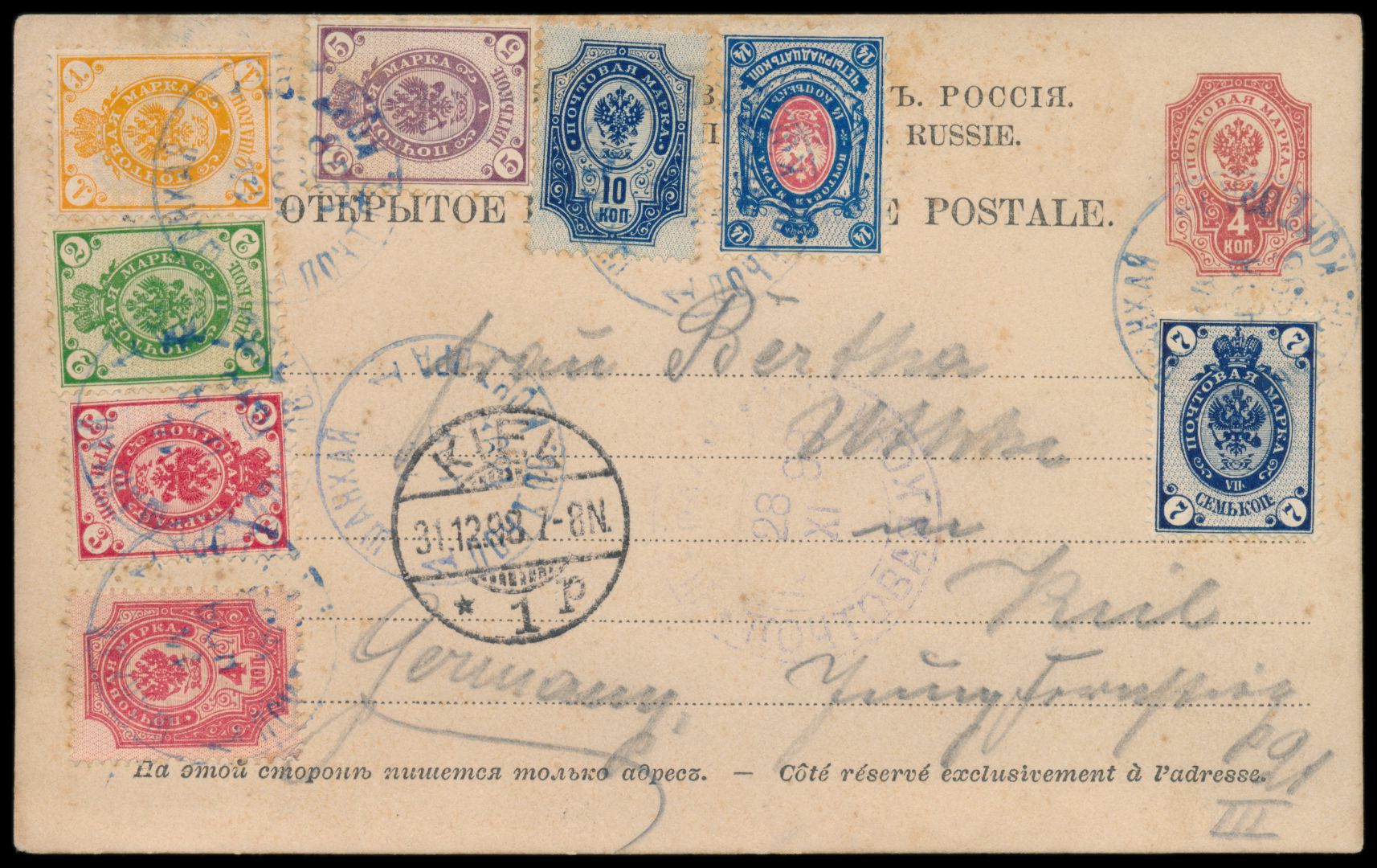 Russische Post, Russland-Ganzsache 4 Kop. mit Zusatzfrankatur Russland 1 Kop. bis 14 Kop. nach Deutschland, 6 x kleiner blauer Einkreisstempel Shanghai 14.11.98 (julianische Datierung) und Zweikreisstempel Shanghai 28.11.1903 (gregorianische Datierung), Ankunftstempel Kiel 31.12.98