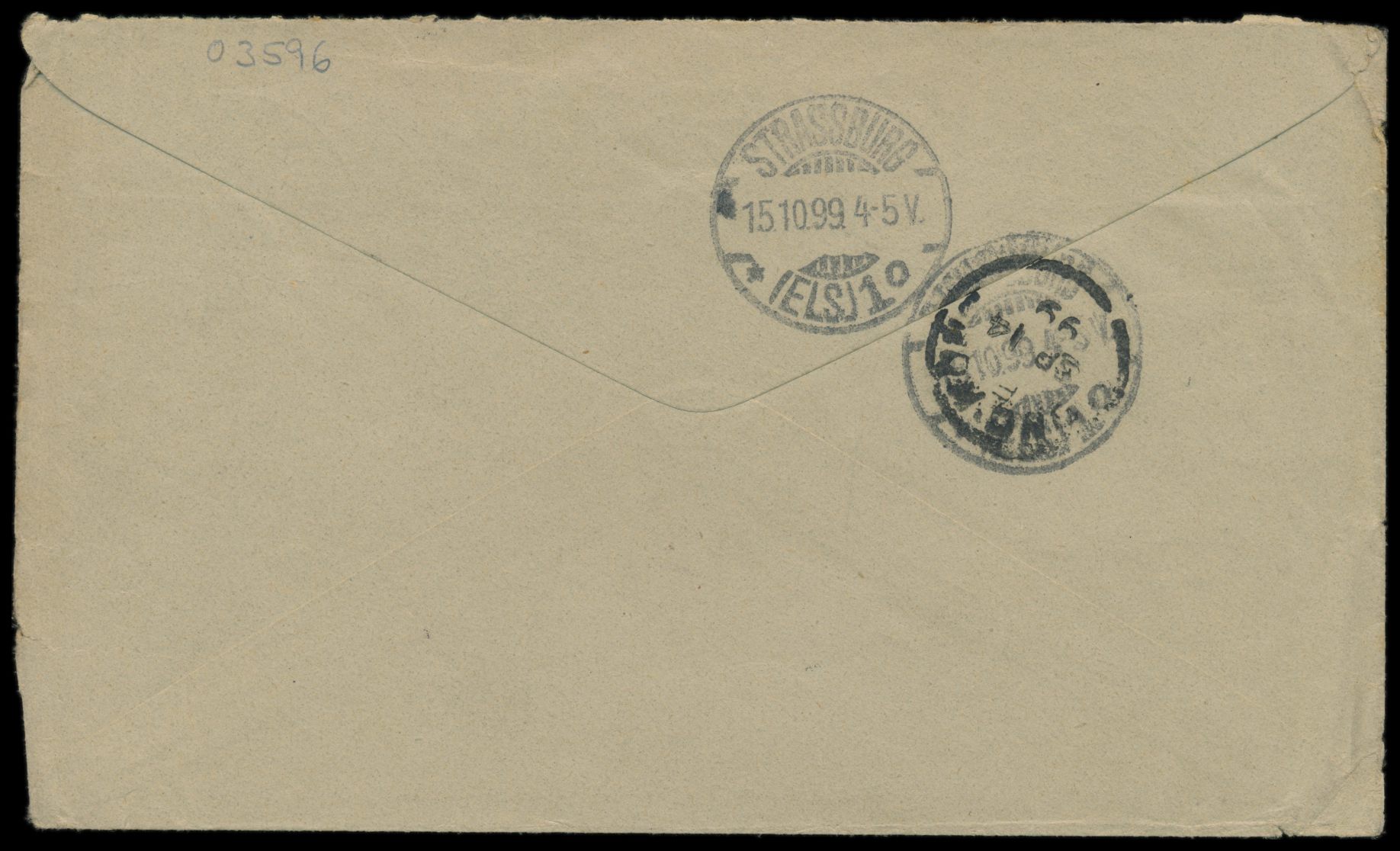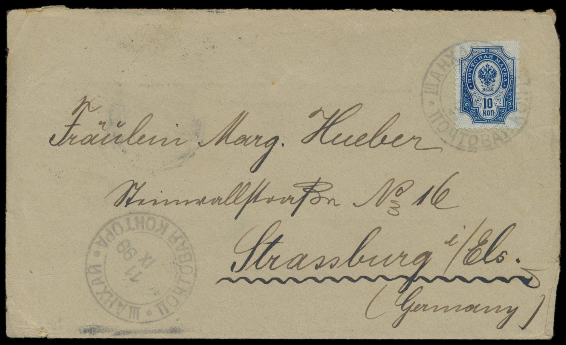 Russische Post, Russland 10 Kop. auf Brief nach Deutschland, 2 x Stempel Shanghai 11.11.1899, Durchgangsstempel Hong-Kong 14.9.99, Ankunftstempel Strassburg (Els.) 15.10.99, Bedarf
