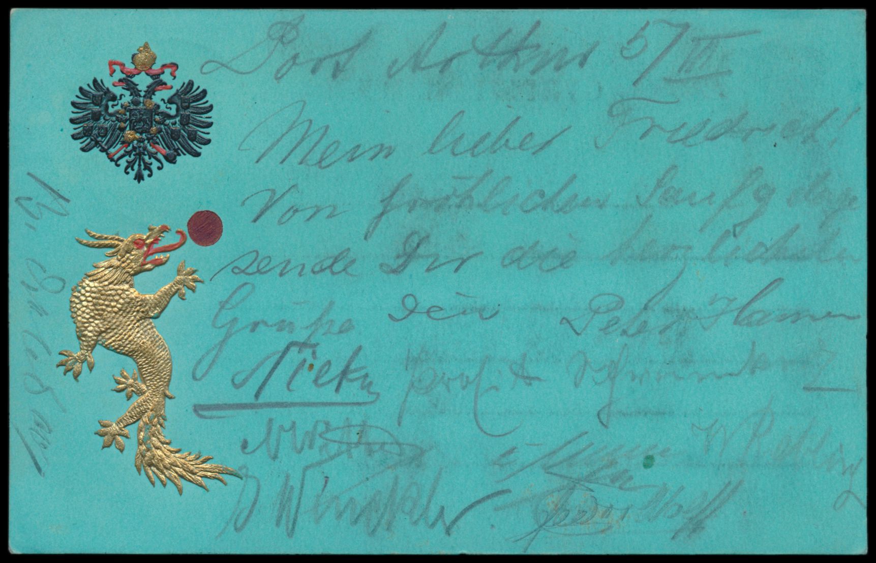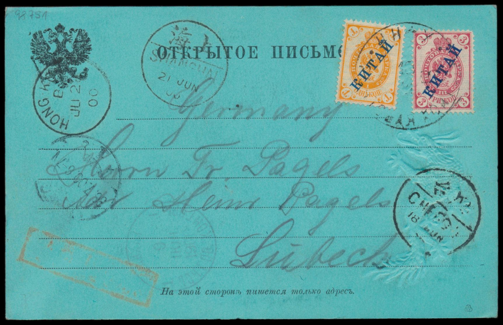 Russische Post, Prägedruck-Ansichtskarte aus Port Arthur über das russische Postamt Chefoo nach Deutschland, Frankatur "Kitai" 1 Kop. und 3 Kop. mit Zweikreisstempel Chefoo 18.6.1900 entwertet, weiter mit chinesischer Post, chinesische Durchgangsstempel Chefoo 18.6.00 und Shanghai 21.6.00, orangener Stempel Paquebot (undeutlich), russischer Durchgangsstempel von Shanghai 9.6.1900 (22.6.1900) und Hong-Kong 28.6.00, Ankunftstempel Lübeck 30.7.00, Bedarf