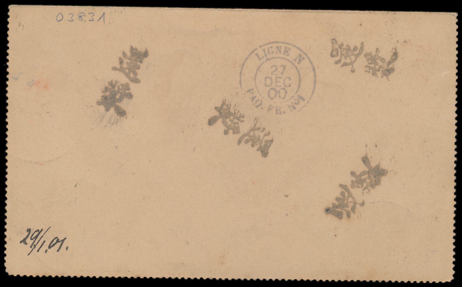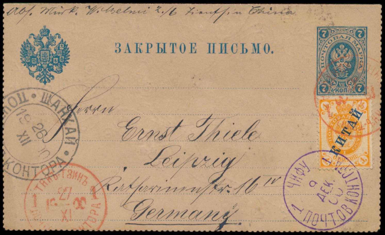 Russische Post, Russland-Kartenbrief 7 Kop. mit Zusatzfrankatur 1 Kop. "Kitai" nach Deutschland, Stempel Tien-Tsin 27.11.1900 in rot, Durchgangsstempel der russischen Post in Tschifu 9.12.00 und Shanghai 26.12.1900, rückseitig französischer Seepoststempel Ligne N Paq. Fr. No. 1 27.12.00, innen mit Zeichnung, Bedarf